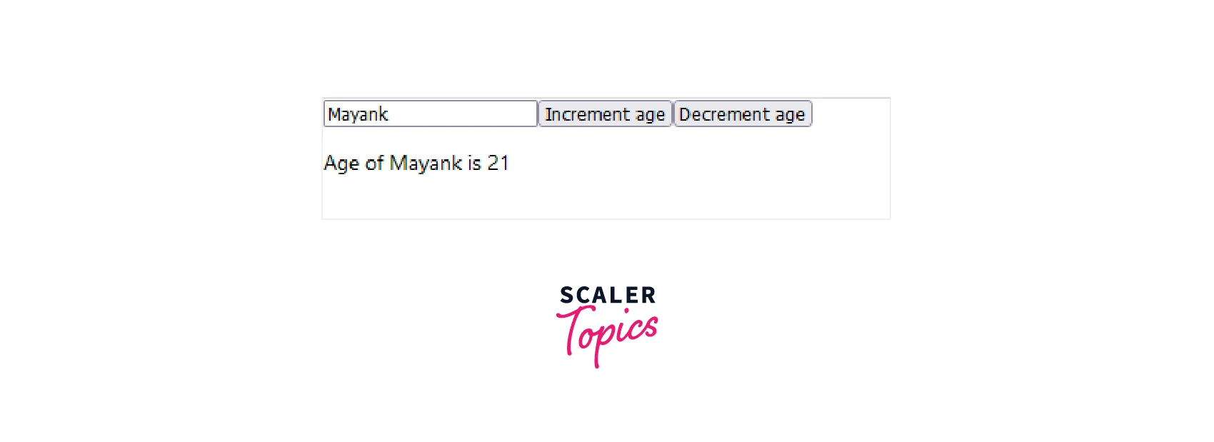 Output: As we can observe in the output, we can dynamically click these increment and decrement buttons to increase and decrease the age state value respectively. Also what we type in the input box, will be reflected as the name whose age is specified.