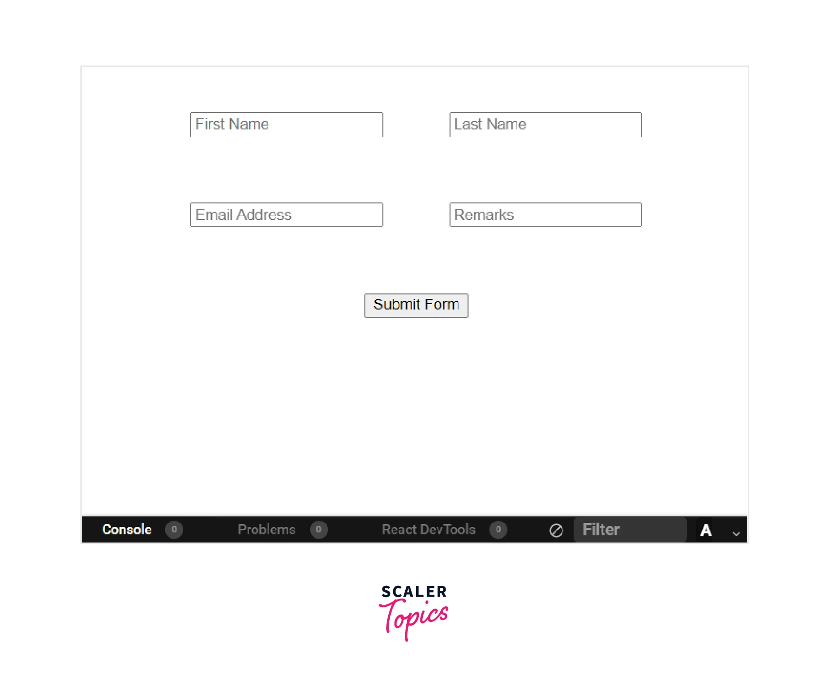 - After step 1, a folder with the name 'form' will be created. Inside this folder, you will see another folder with the name 'src' which is containing a file with the name 'App.js'. We will be writing our React code inside this file only. Given below is the code to create a form inside this file.