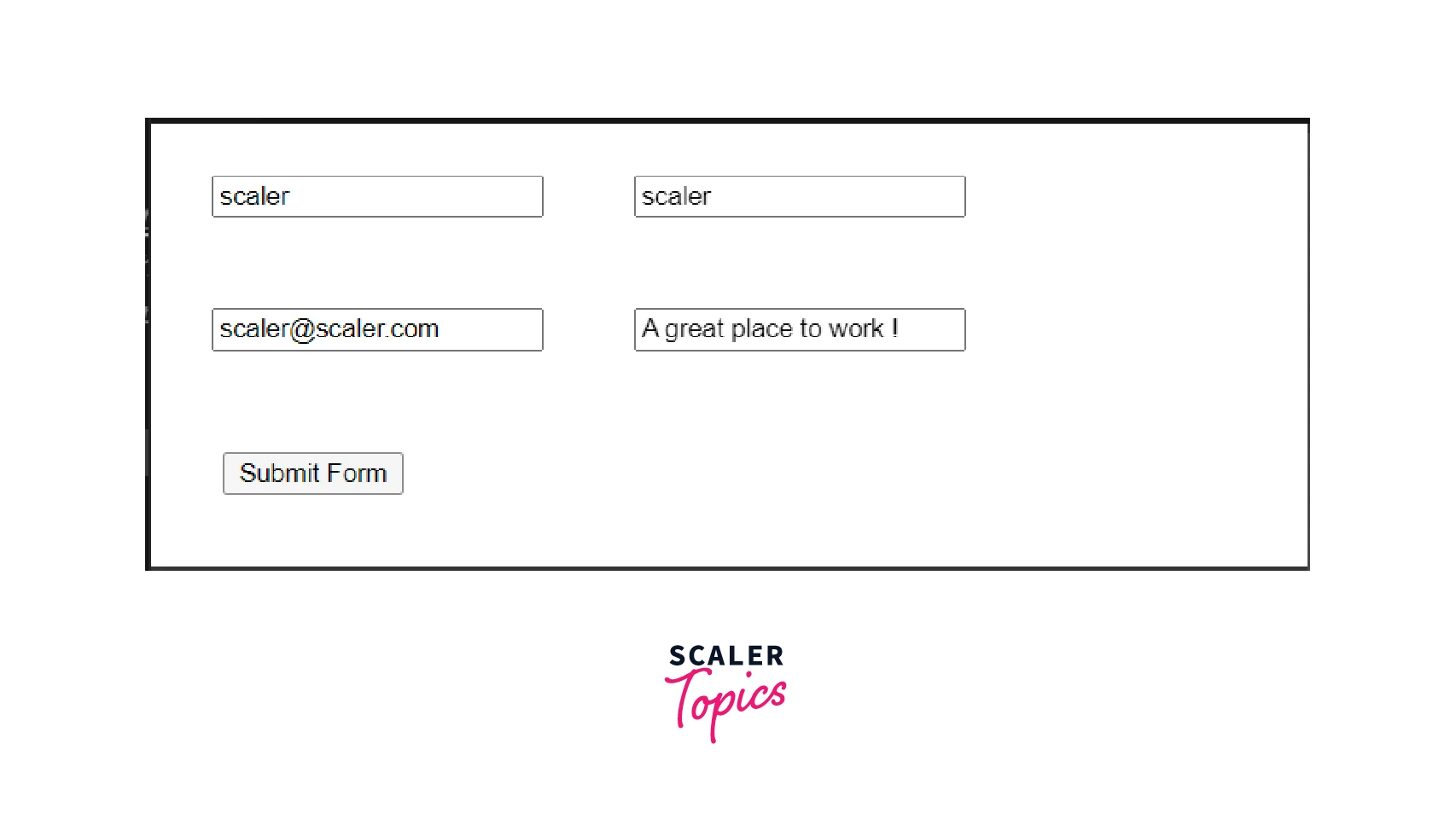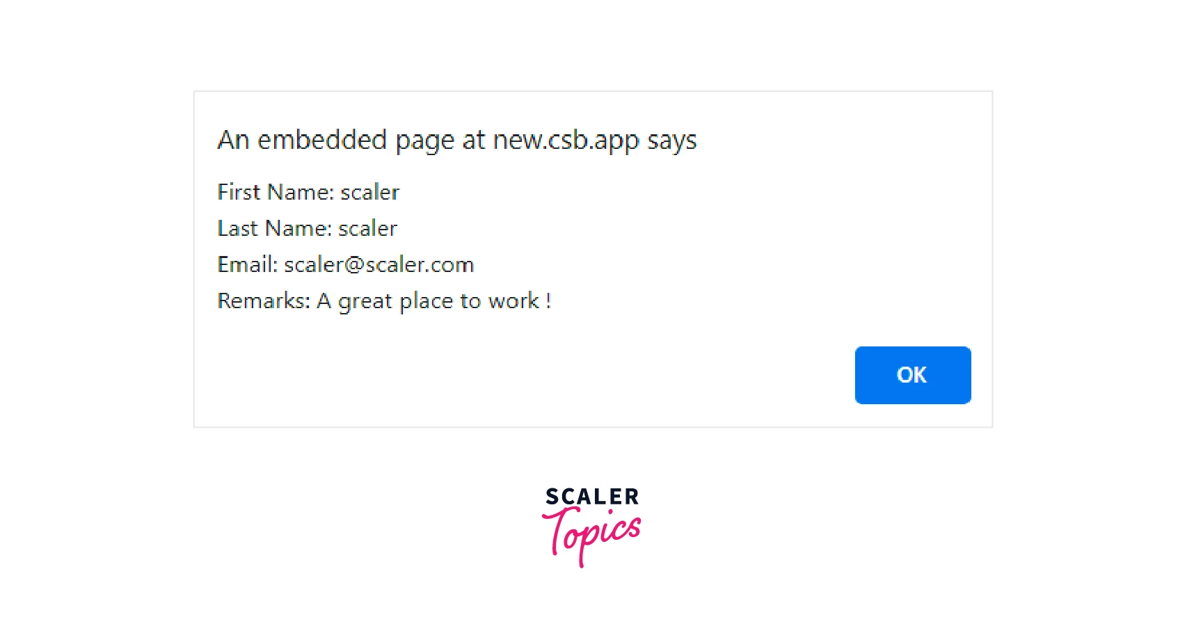 When we click on the 'submit form' button, an alert box pops up with all the input values.