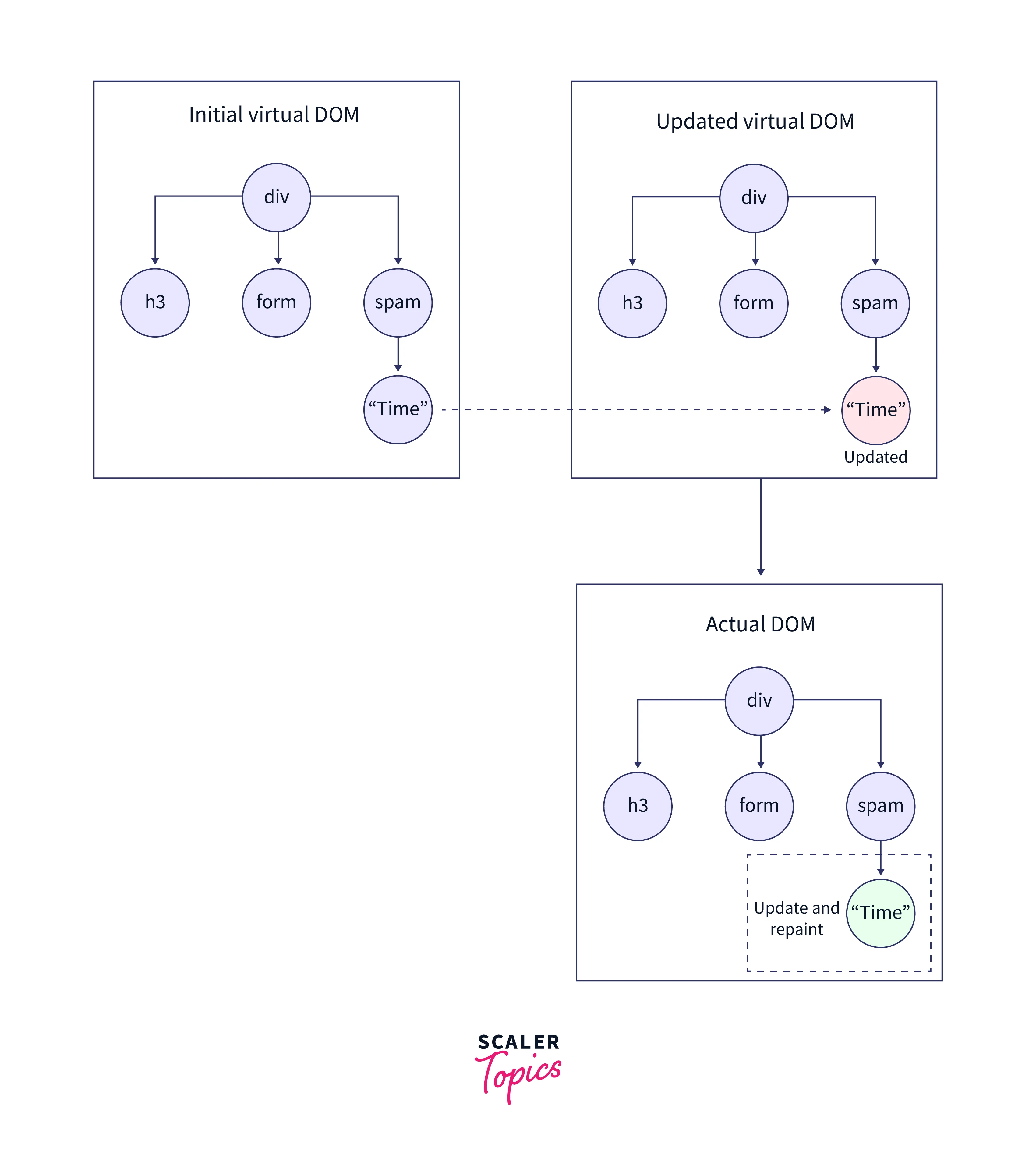 Since DOM is itself represented as a tree, updating the tree, in this case, is not a time-consuming process; in fact, we have several algorithms on trees to make the changes quickly. The modified element and its children must be rendered anew to update the UI of our page whenever the DOM is updated, which is proving to be expensive. Similarly, the DOM must be updated and the UI components must be rendered again whenever a component is modified.