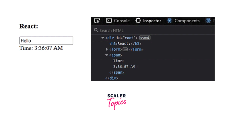 The original render is seen on the left-hand image. React builds a new tree with the modified node as the time changes, as can be seen on the right. Keep in mind that the virtual DOM is merely an object that represents the UI; nothing is displayed on the screen.