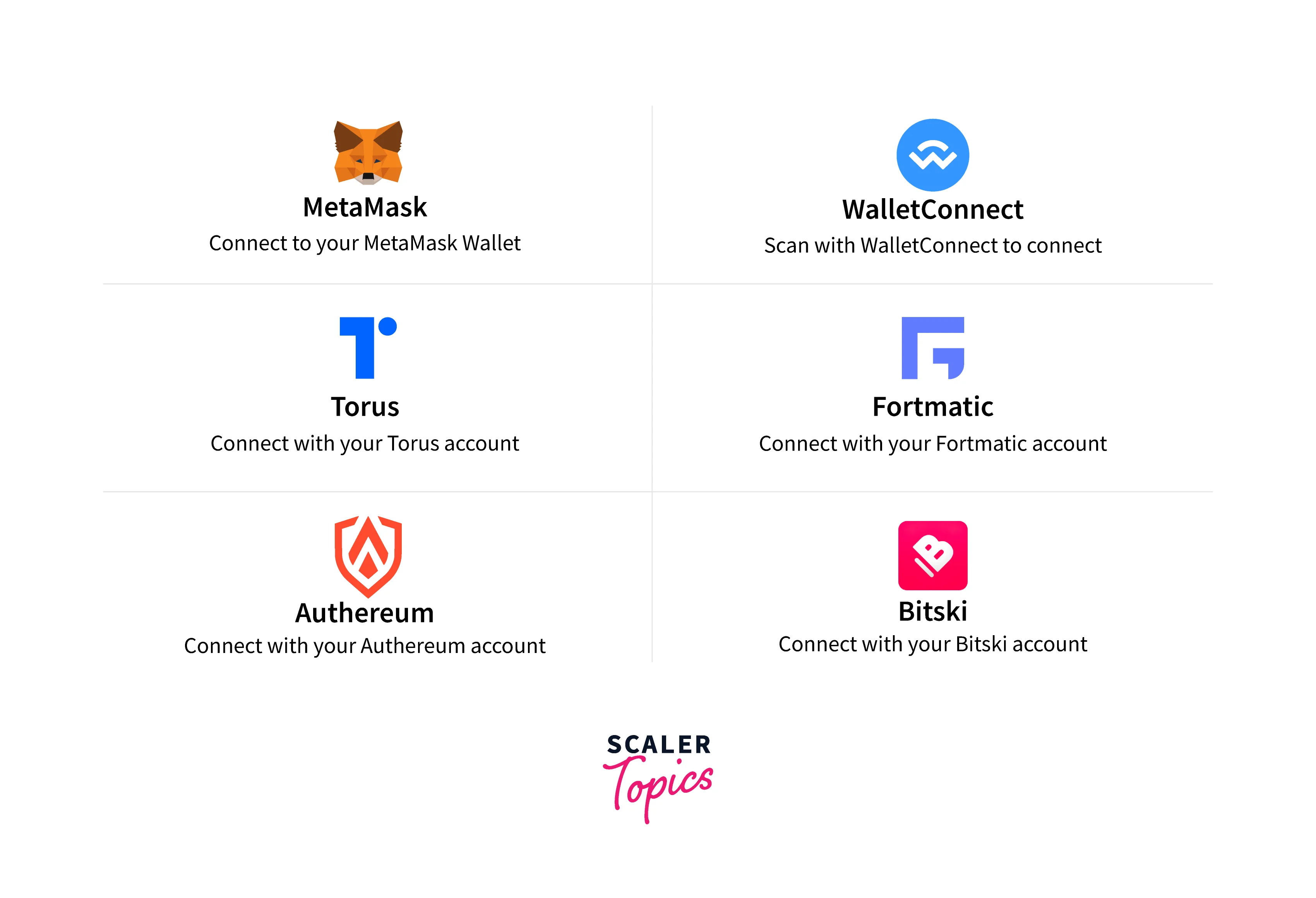 It supports injected providers ( injects a global API into websites visited by its users ) like WalletConnect, Meta Mask, Gnosis Safe, and Frame by default. It is simple to set up to use different wallets like Portis, Squarelink, and Arkane.