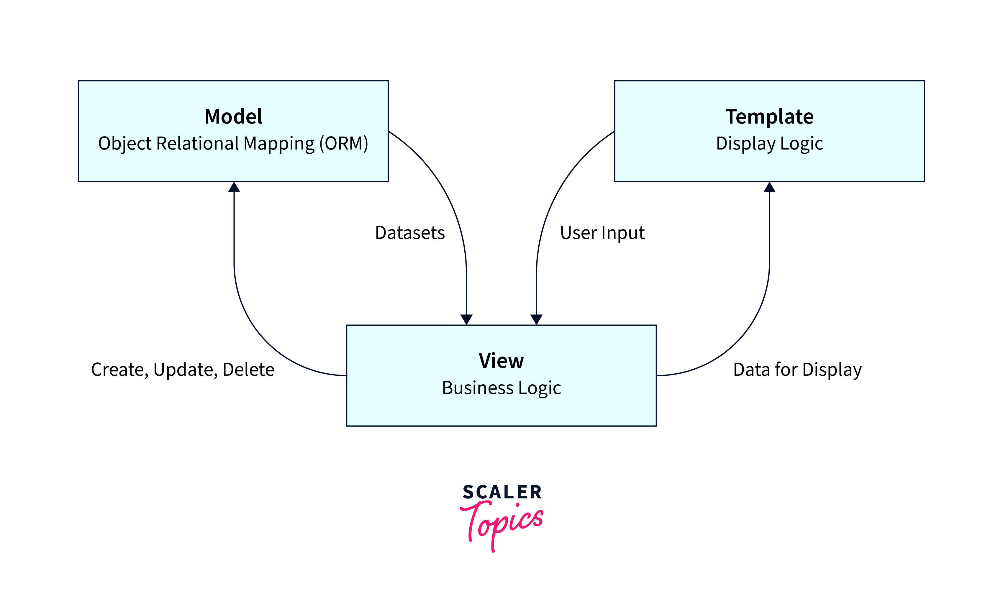- In the MVT pattern, the Model handles database interactions, the View handles the business logic between the Model and the Template, and the Template handles rendering HTML templates.