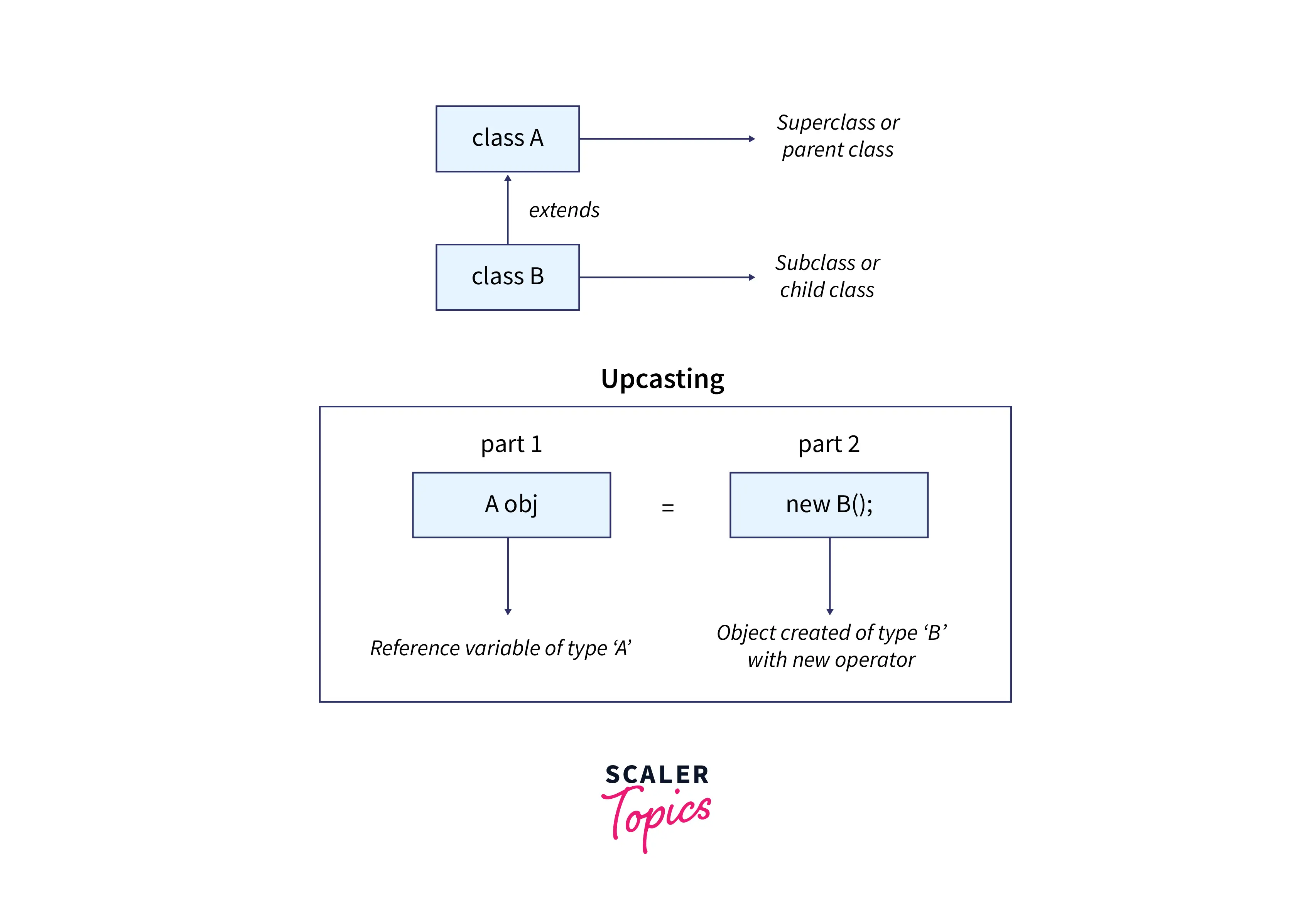 Here, the reference variable is referring to the object of class B. The reference variable belongs to the superclass or parent class while the object is made up of the subclass or child class. It is also known as upcasting.