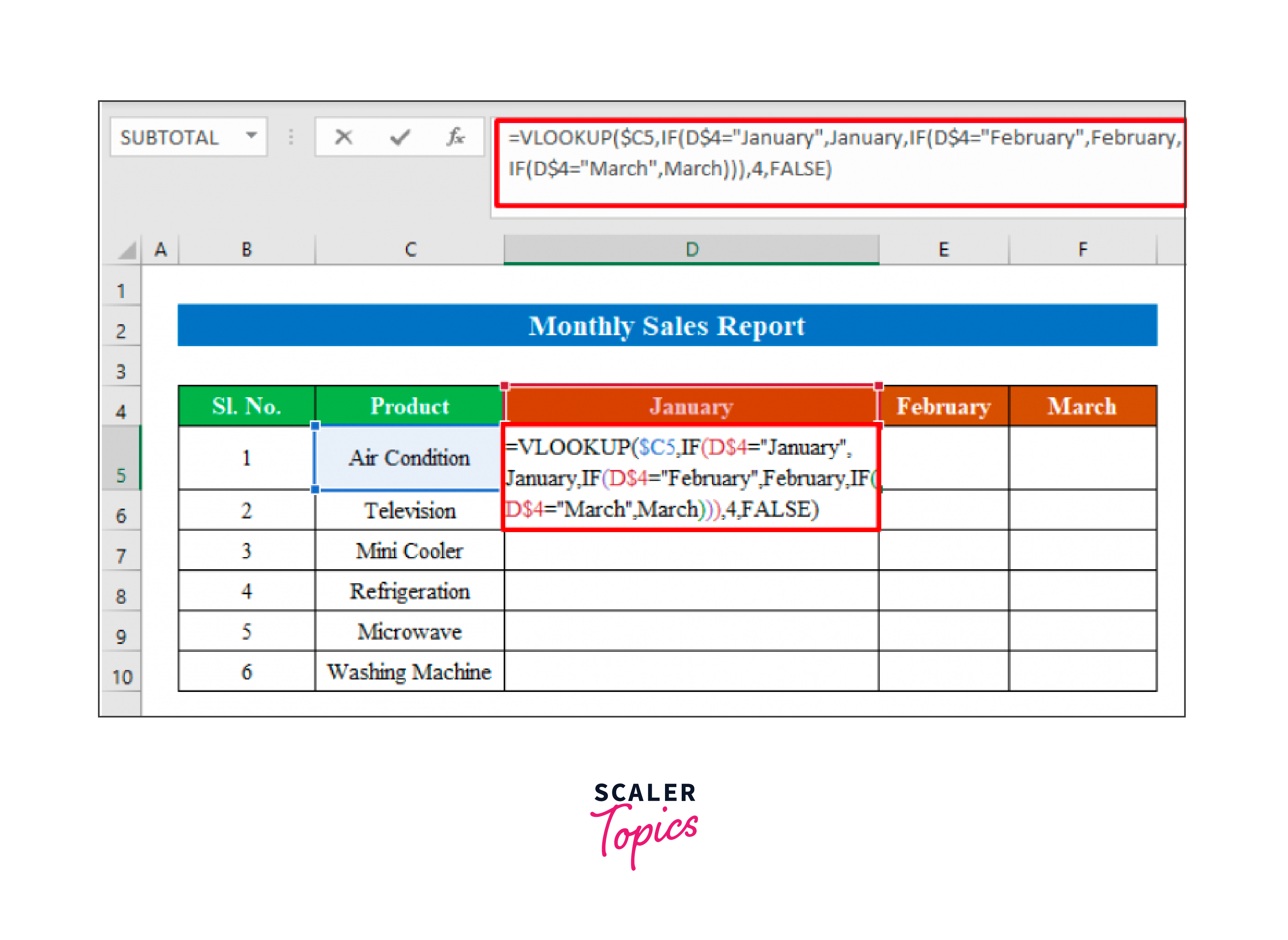 - In order to use the formula, choose a cell. I've chosen a cell here (D5). Enter the formula in the chosen cell: =VLOOKUP(4="January",January,IF(D4="March",March))),4,FALSE)