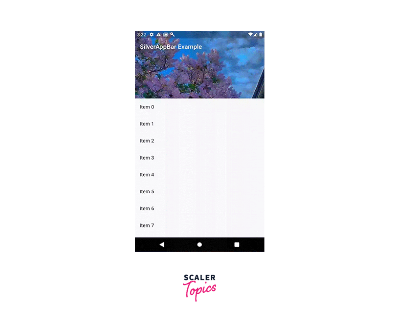 | Floating behavior | By default, the SilverAppBar remains pinned at the top of the screen as the user scrolls. However, you can change this behavior by setting the floating property to true. When floating is enabled, the SilverAppBar will float on top of the scrollable content and become partially hidden when scrolling down. |