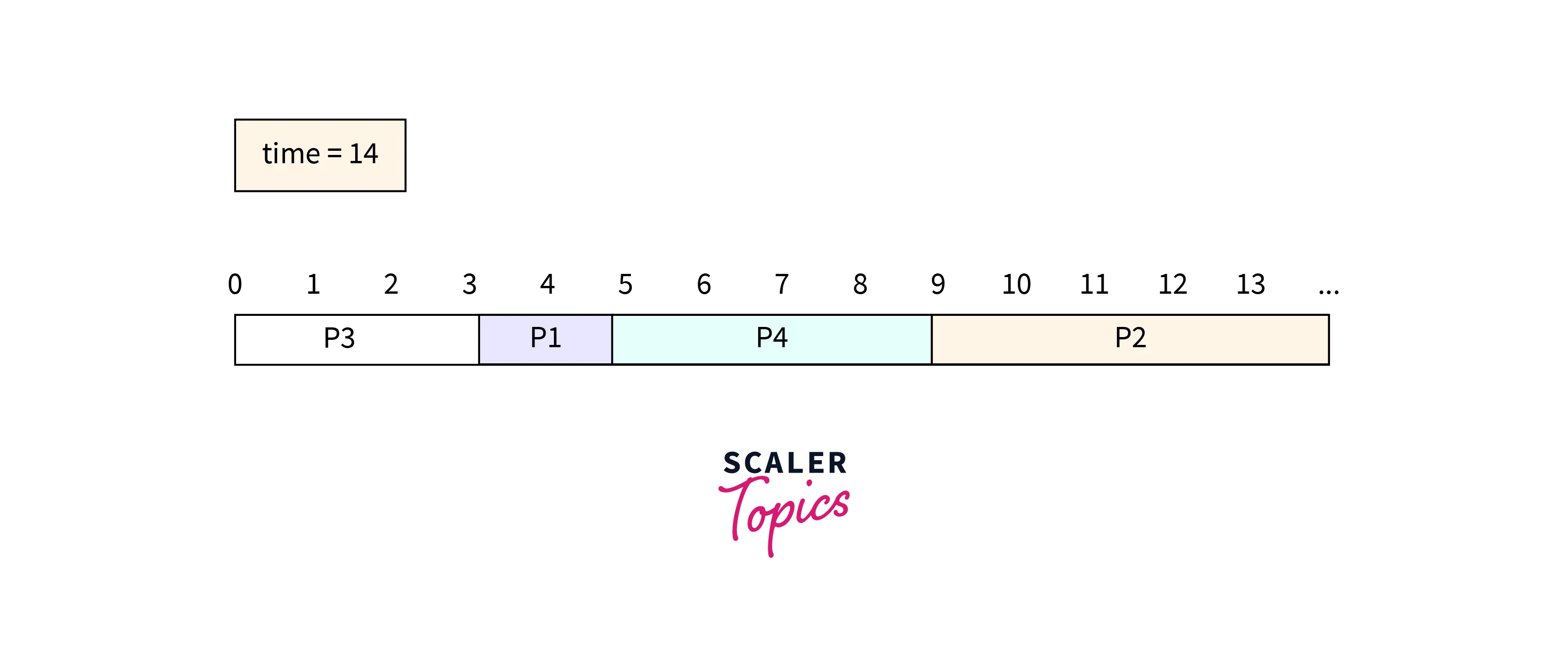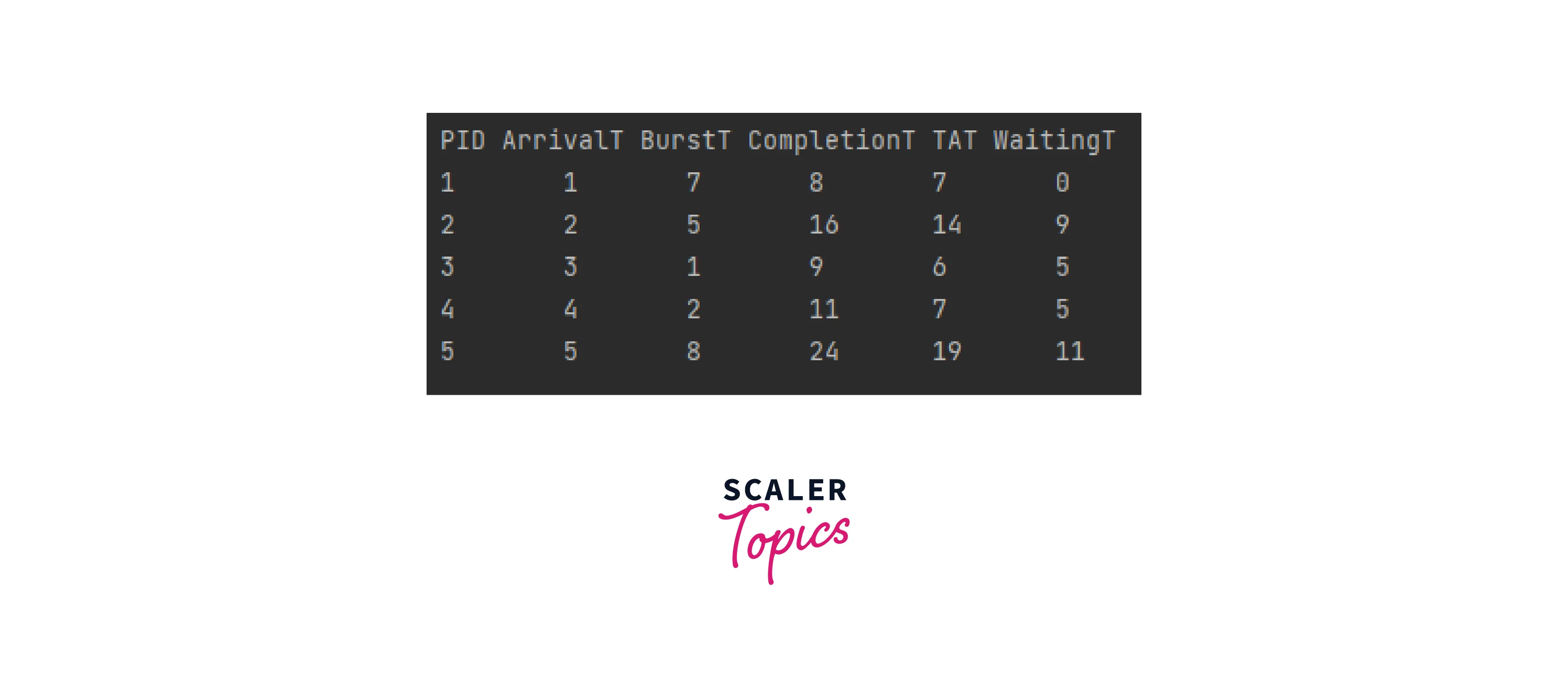 In the above example, we are taking the arrival time of each process to be . The processes are executed in ascending order according to their burst times because their arrival times are all zero. As a result, the processes are executed in the following order: