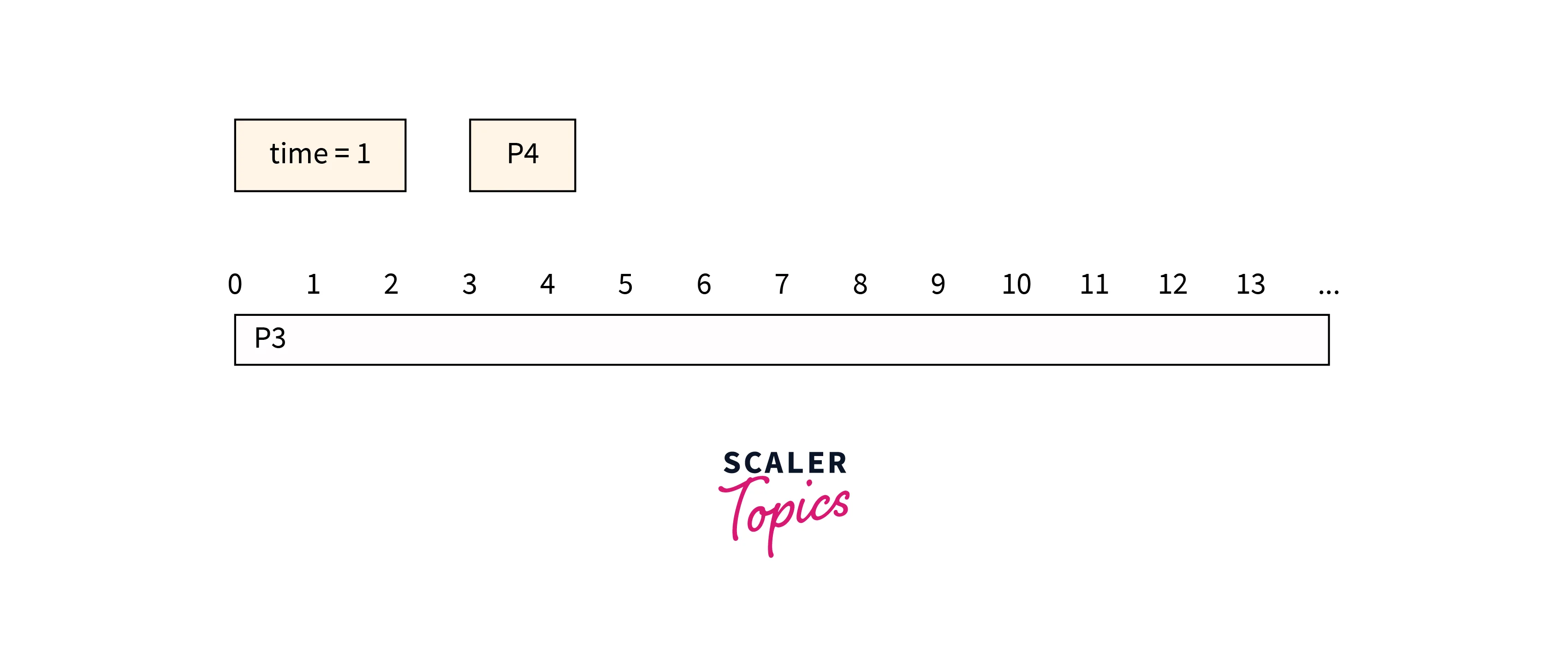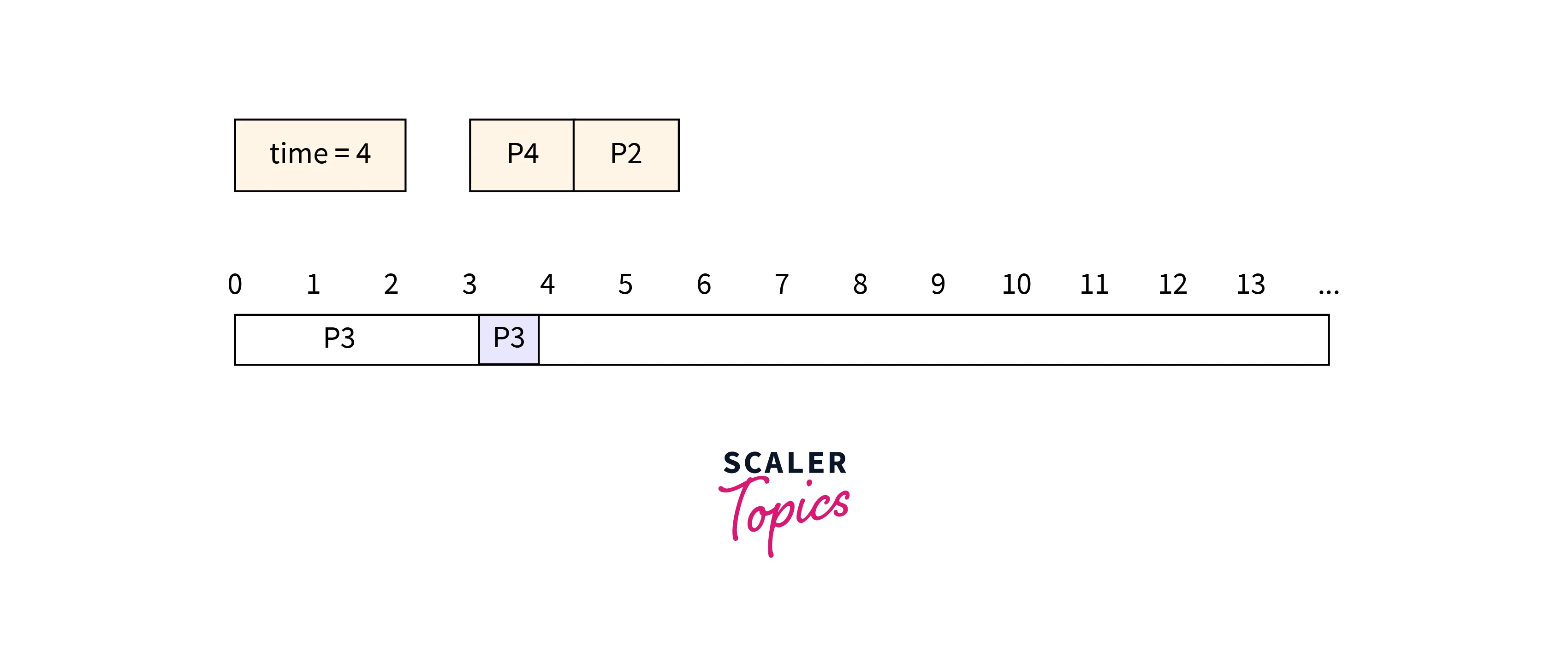 Step 4: At , process arrives and joins the queue of processes waiting for execution. process continues its execution on the CPU, and remains in the queue.