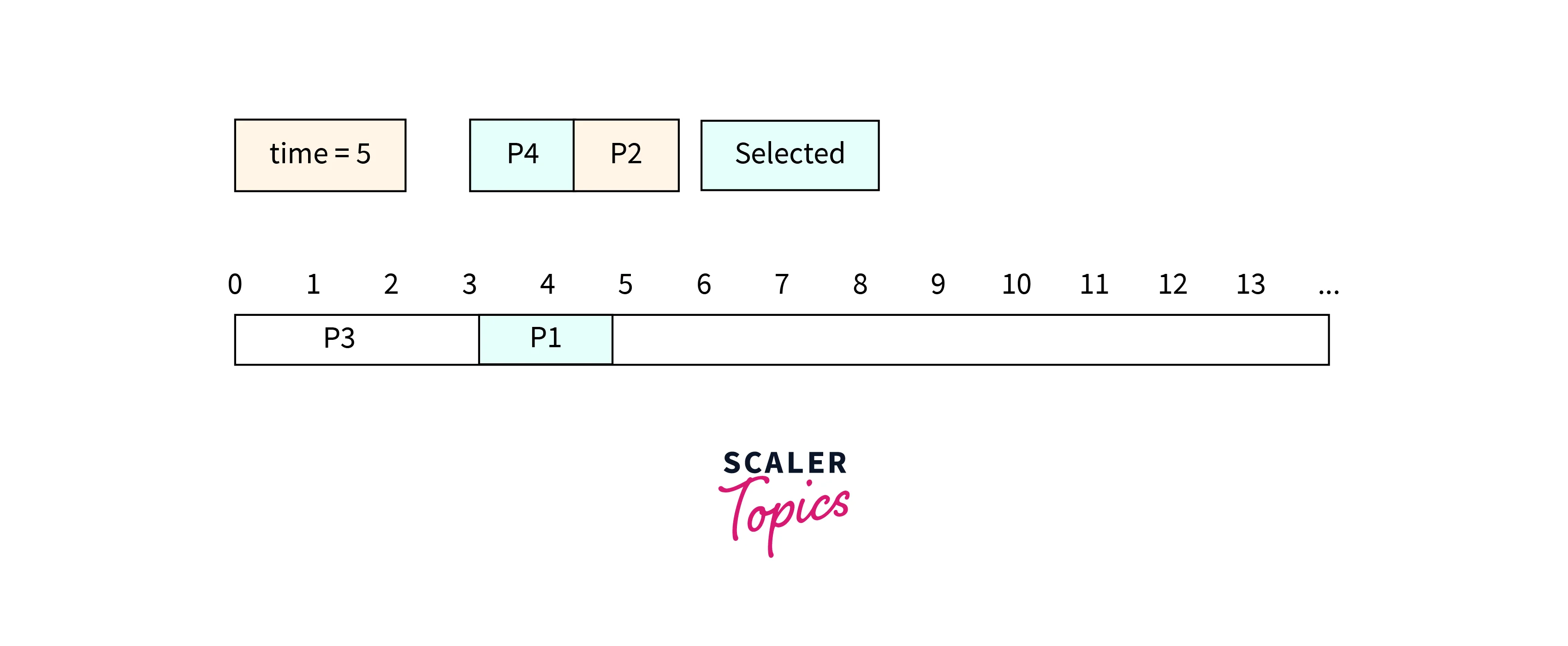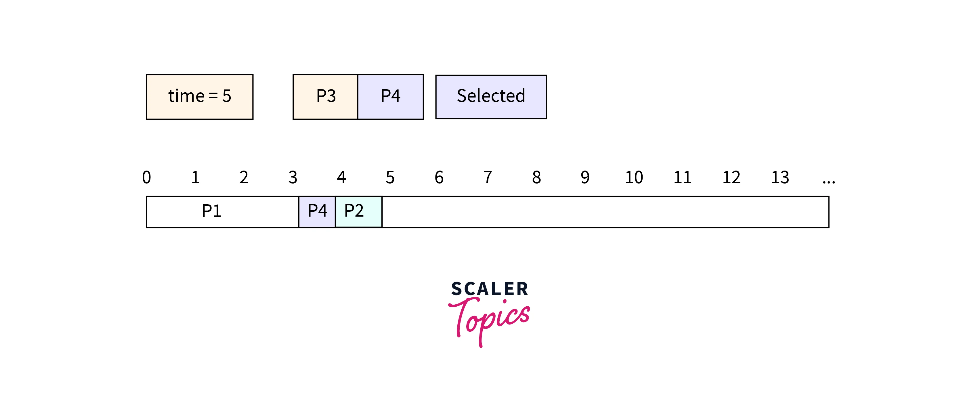 Step 5: At , process execution gets completed. We compare the burst times of and . Process goes into the CPU for execution because it has a shorter burst time than Process does.