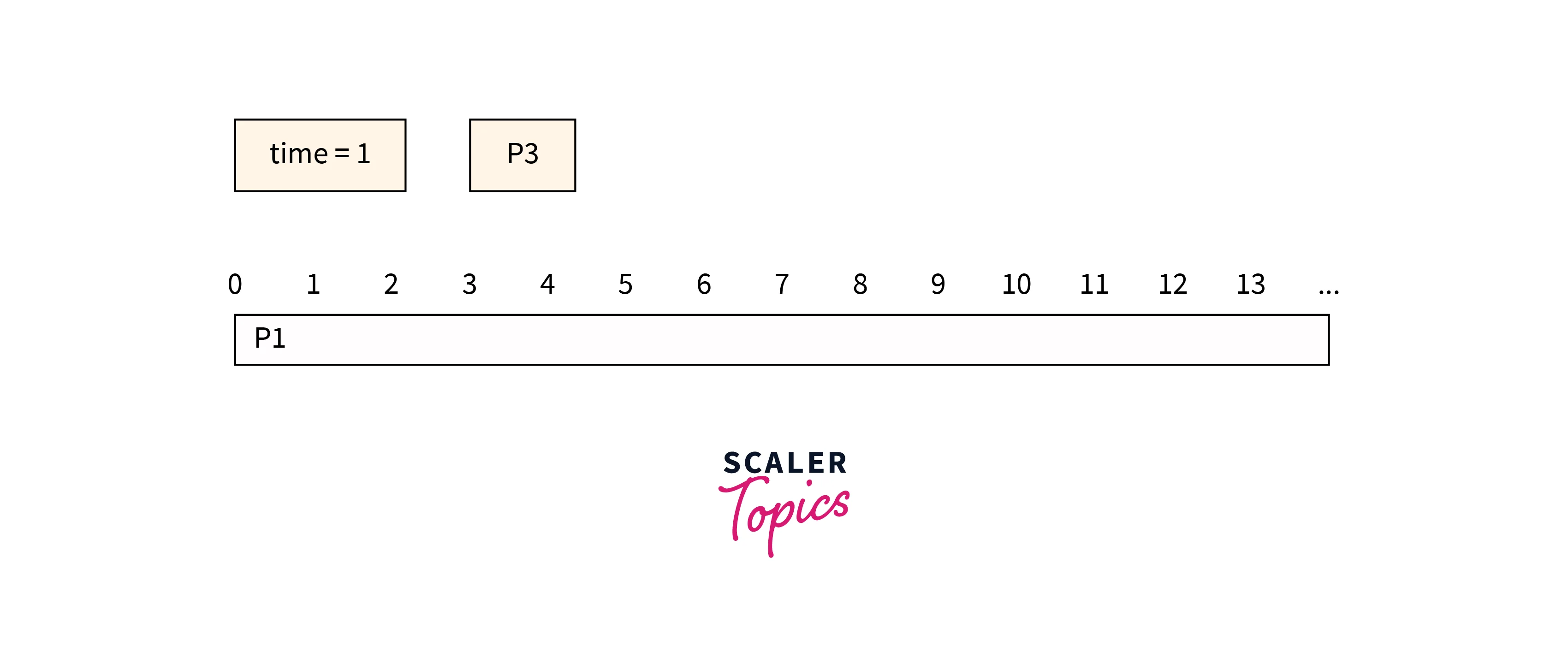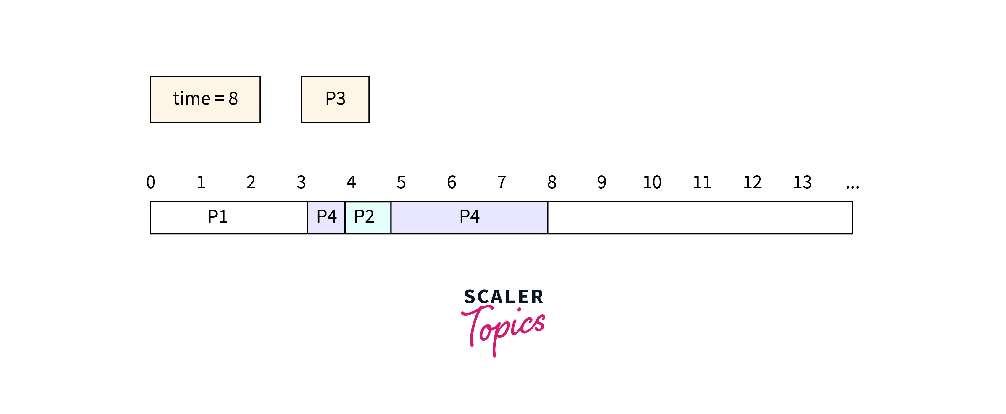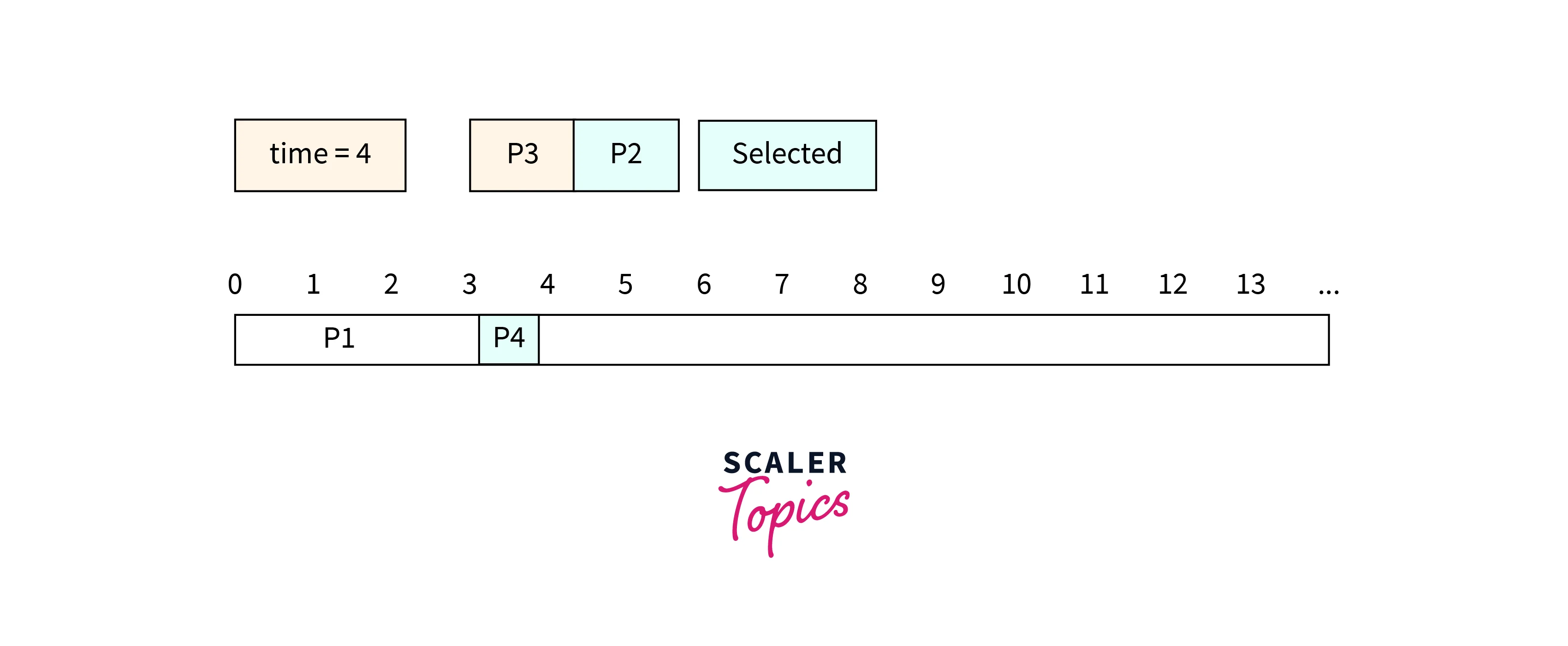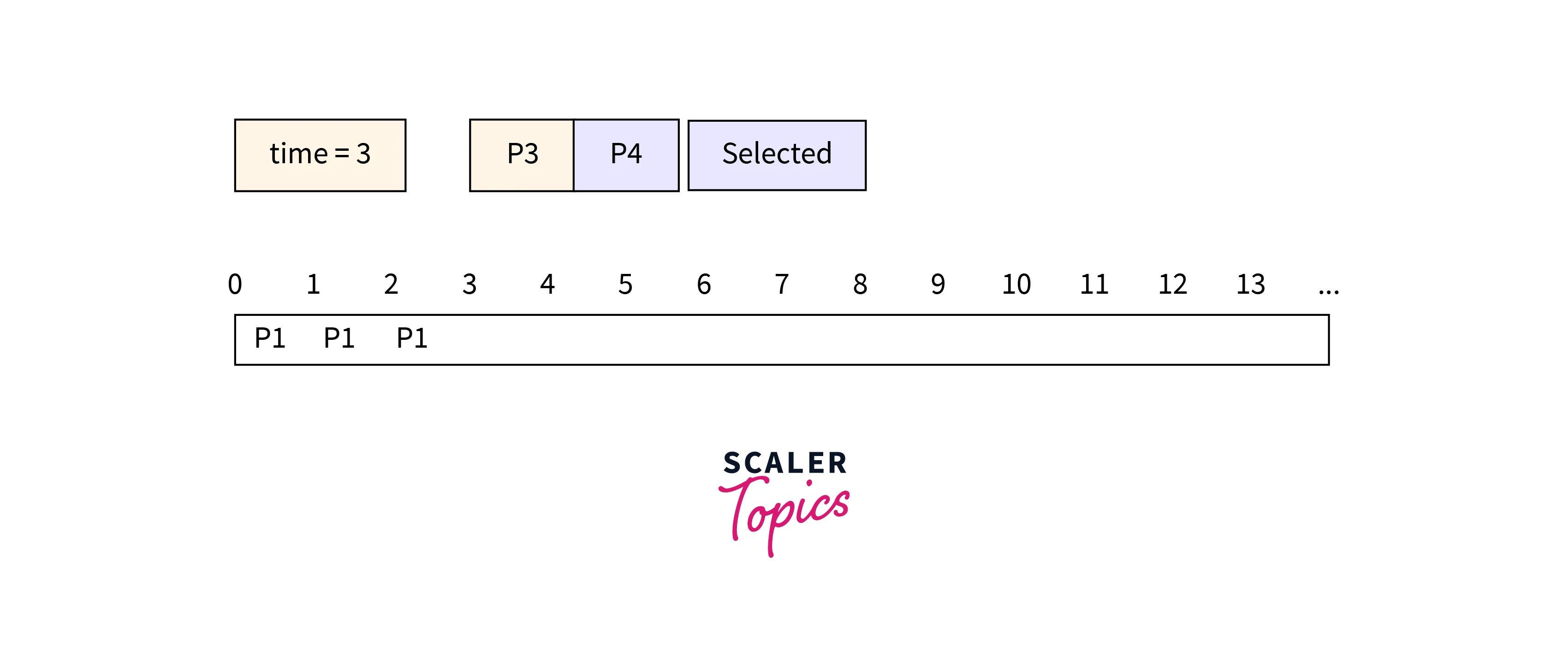 Step 3: At , process completes its execution. We compare the burst times of and . Process goes into the CPU for execution because it has a shorter burst time than Process does.