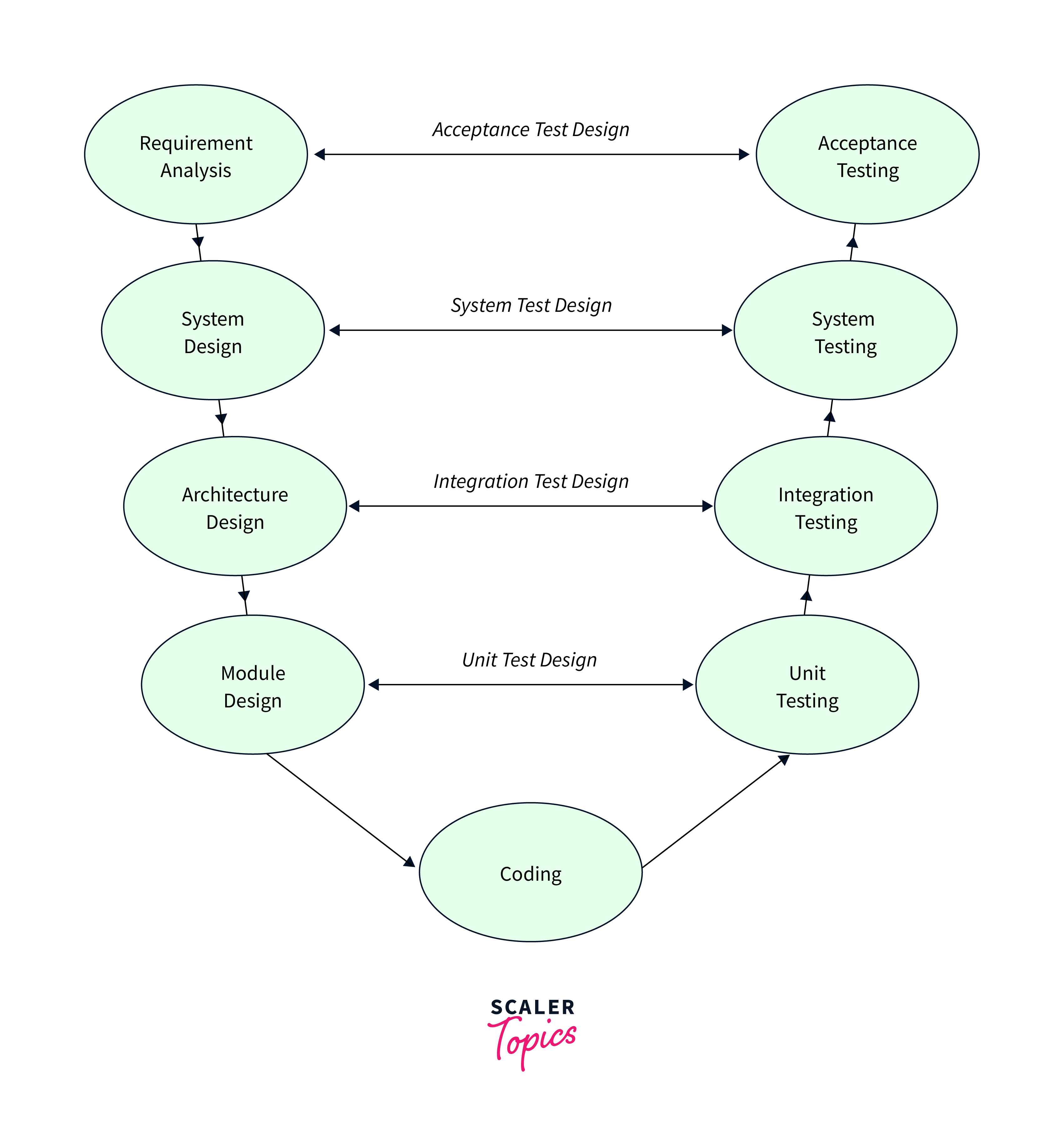 - Phases: Requirements → System design → Architecture design → Module design → Coding → Unit testing → Integration testing → System testing → Acceptance testing.