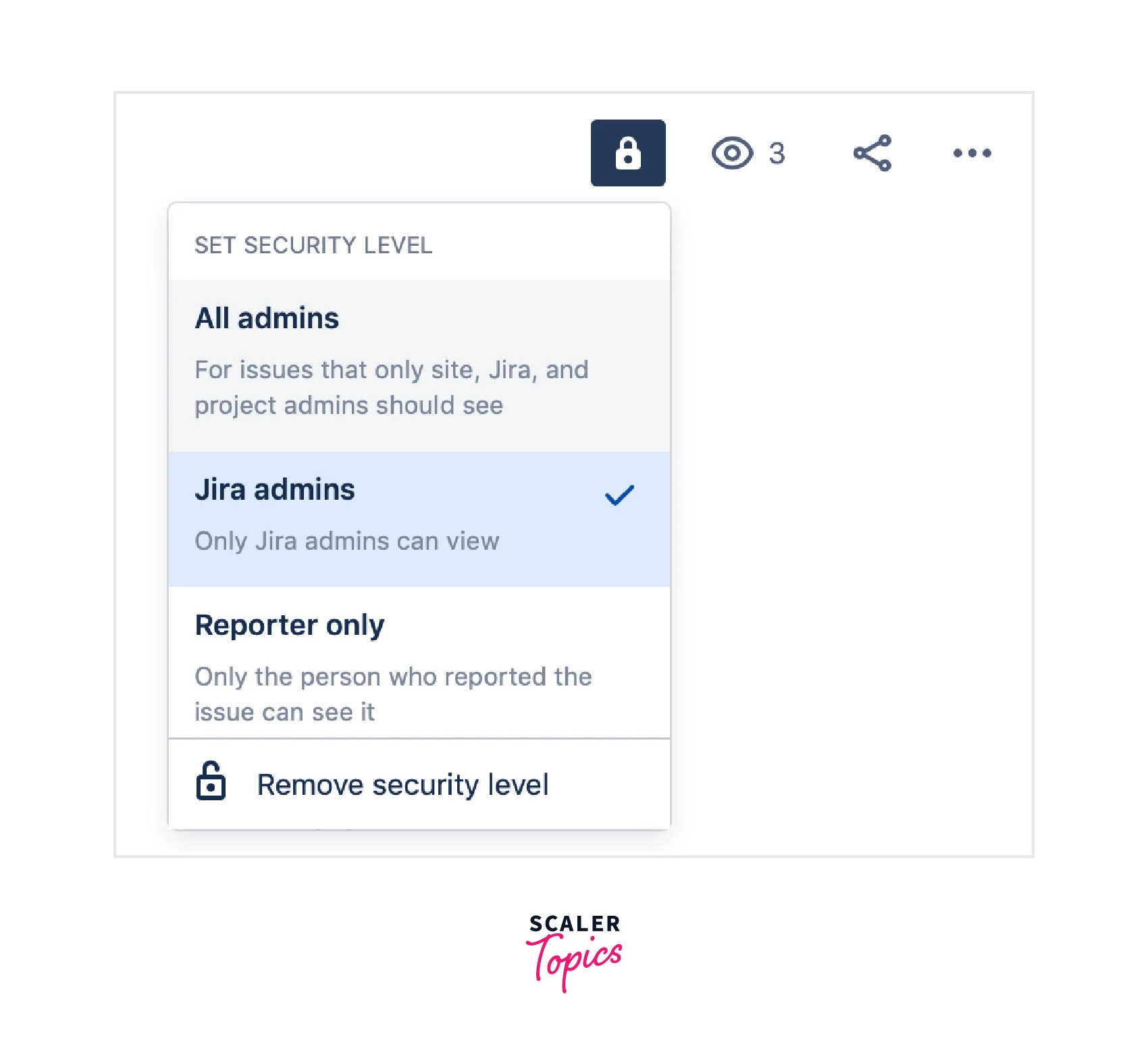 - Jira administrators can manage security levels and their memberships by issuing security schemes.
