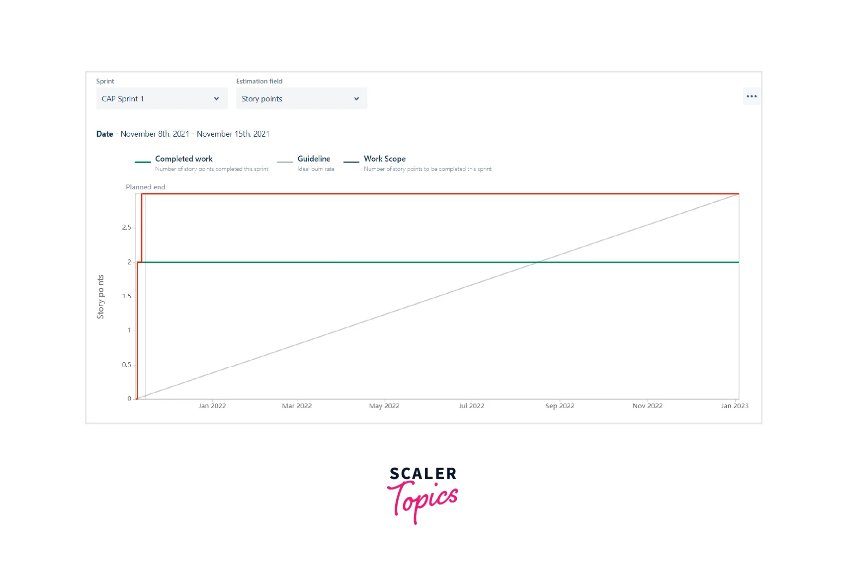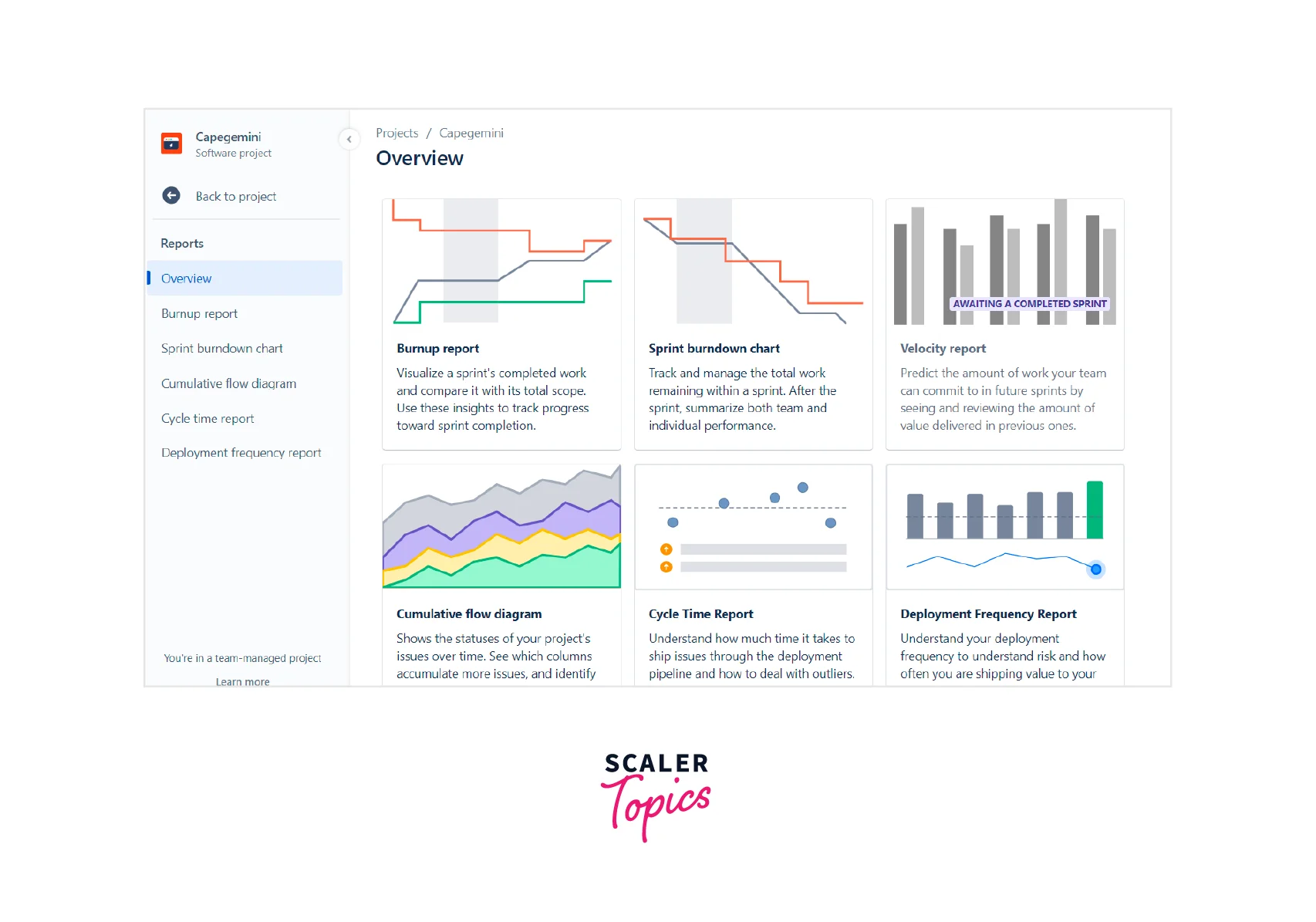 - Sprint report gives scrum team insights into the tasks that have been completed vs. left.