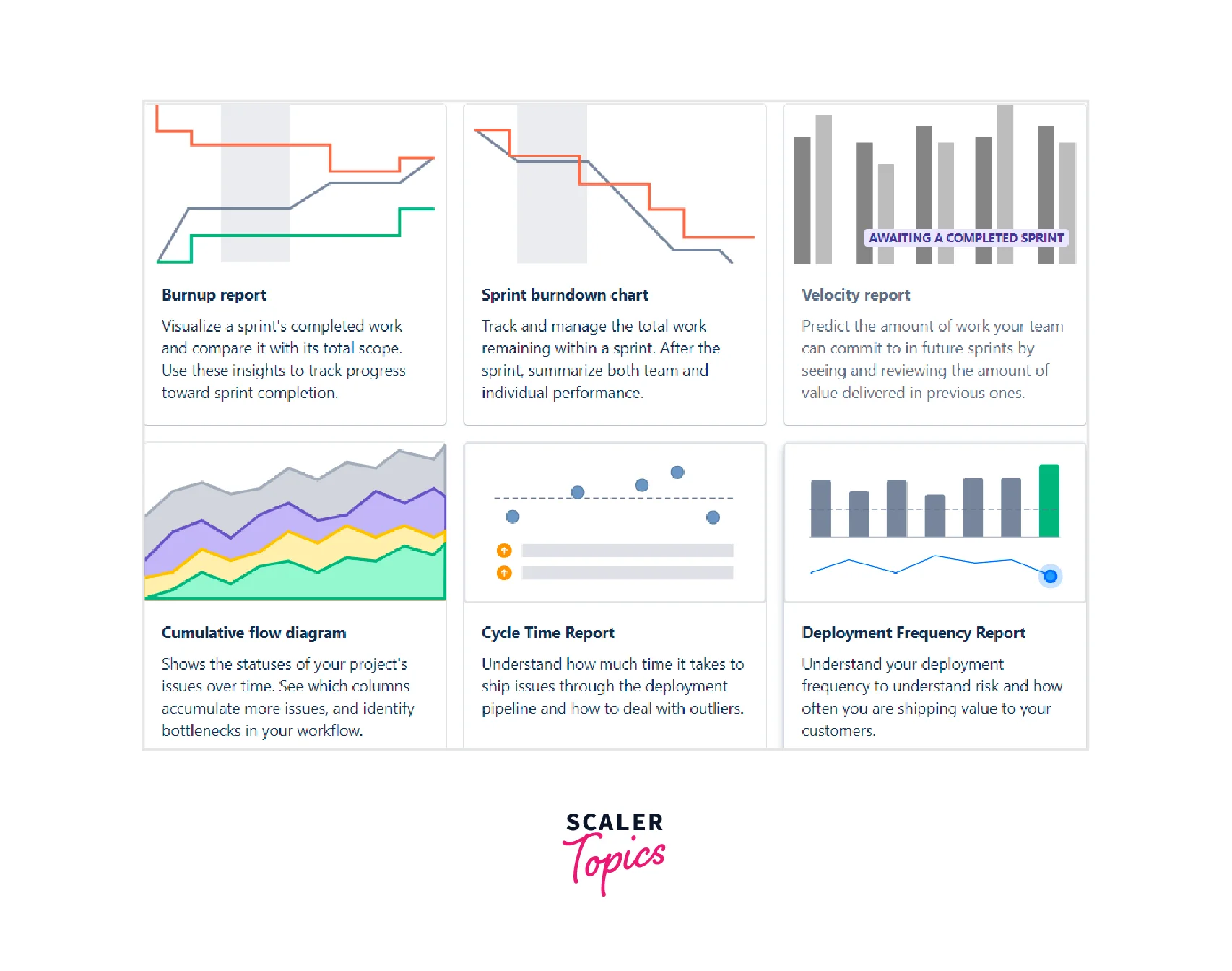 - The most common charts offered are the burndown chart, velocity chart, and burn-up chart.
