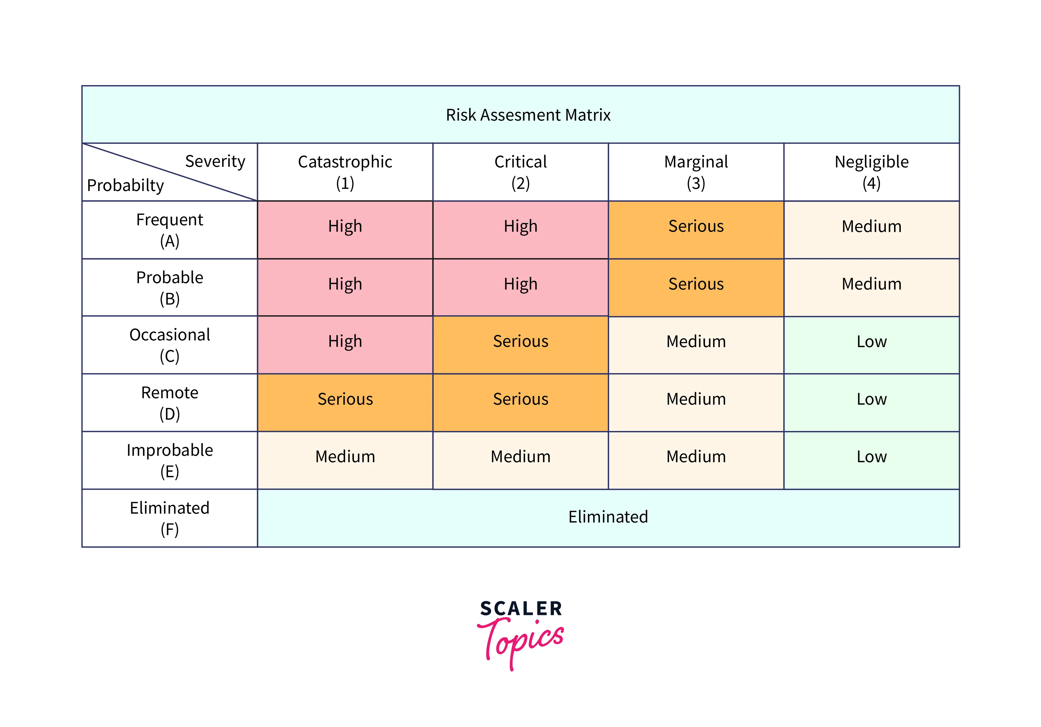 A risk Assessment Matrix is a tabular matrix between an event's probability of occurrence vs. the event's severity. It helps to consider all the factors and label the risk. Risk is categorized based on frequency (how frequently the event is occurring), probable (how likely it would occur), occasion (is it an occasional or occurs a few times), remote (occurs sometimes or not), improbable (occur rarely or not), eliminate (is it impossible to get rid of).