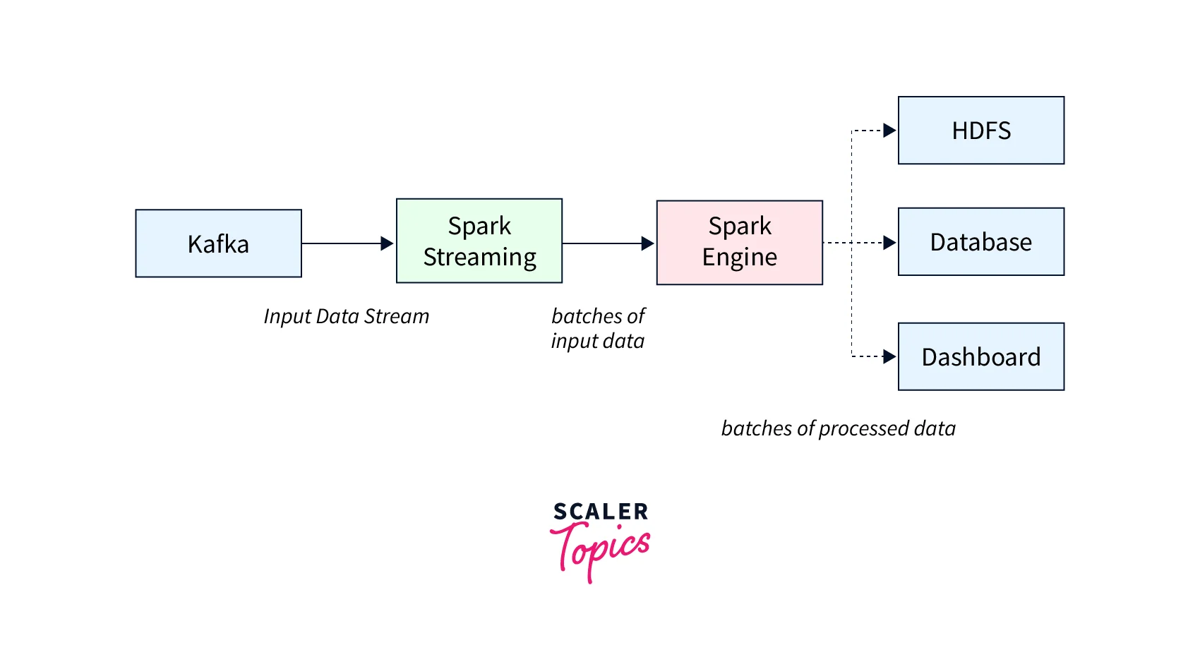 The live data stream is input in Spark Streaming which is split into batches. Then with the Spark engine, these batches of data are processed for producing the final batch result stream. This offers versatile data integrations through various data sources with Spark Streaming with Kafka.