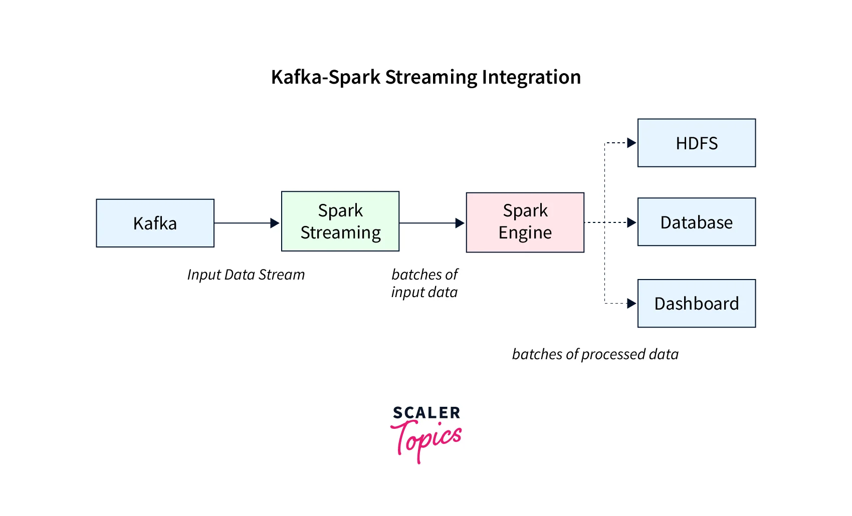 Spark Streaming is a high-throughput, scalable, and fault-tolerant streaming data processing system that could support both streaming and batching workloads. For real-time data processing, Spark offers this Spark streaming with Kafka extension of the core Spark API from various sources like Flume, Amazon Kinesis, Kafka, etc. Data is processed and pushed to systems such as Kafka, live dashboards, databases, etc.