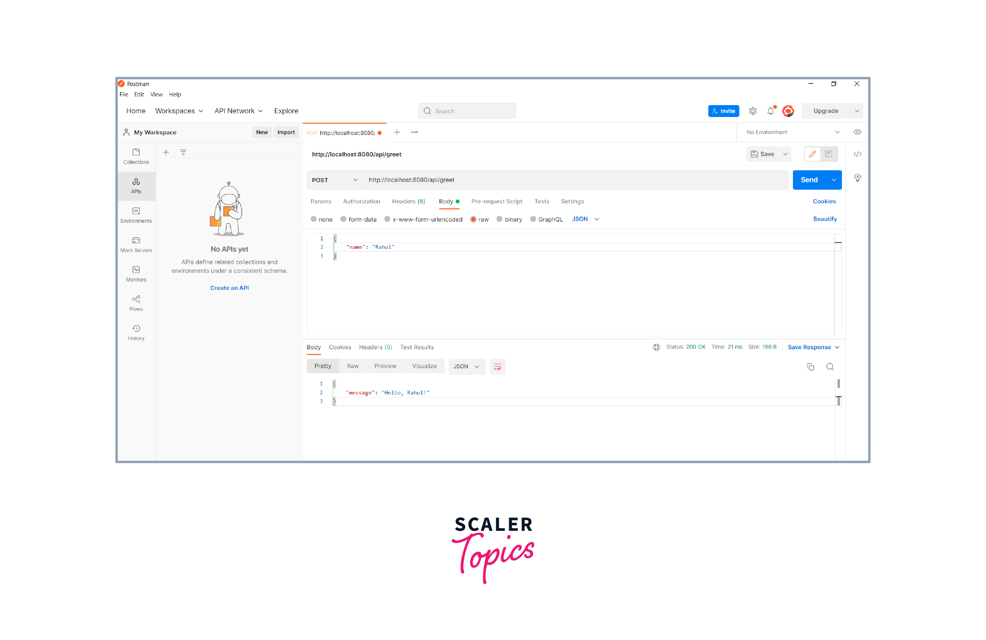 - public String greetUser(@RequestBody String name): This method will be executed when a POST request is made to "/greet." The @RequestBody annotation indicates that the name parameter is expected to be part of the request body. In this case, it is assumed that the client will send a JSON or plain text body containing the name. The method then returns a greeting message incorporating the provided name.