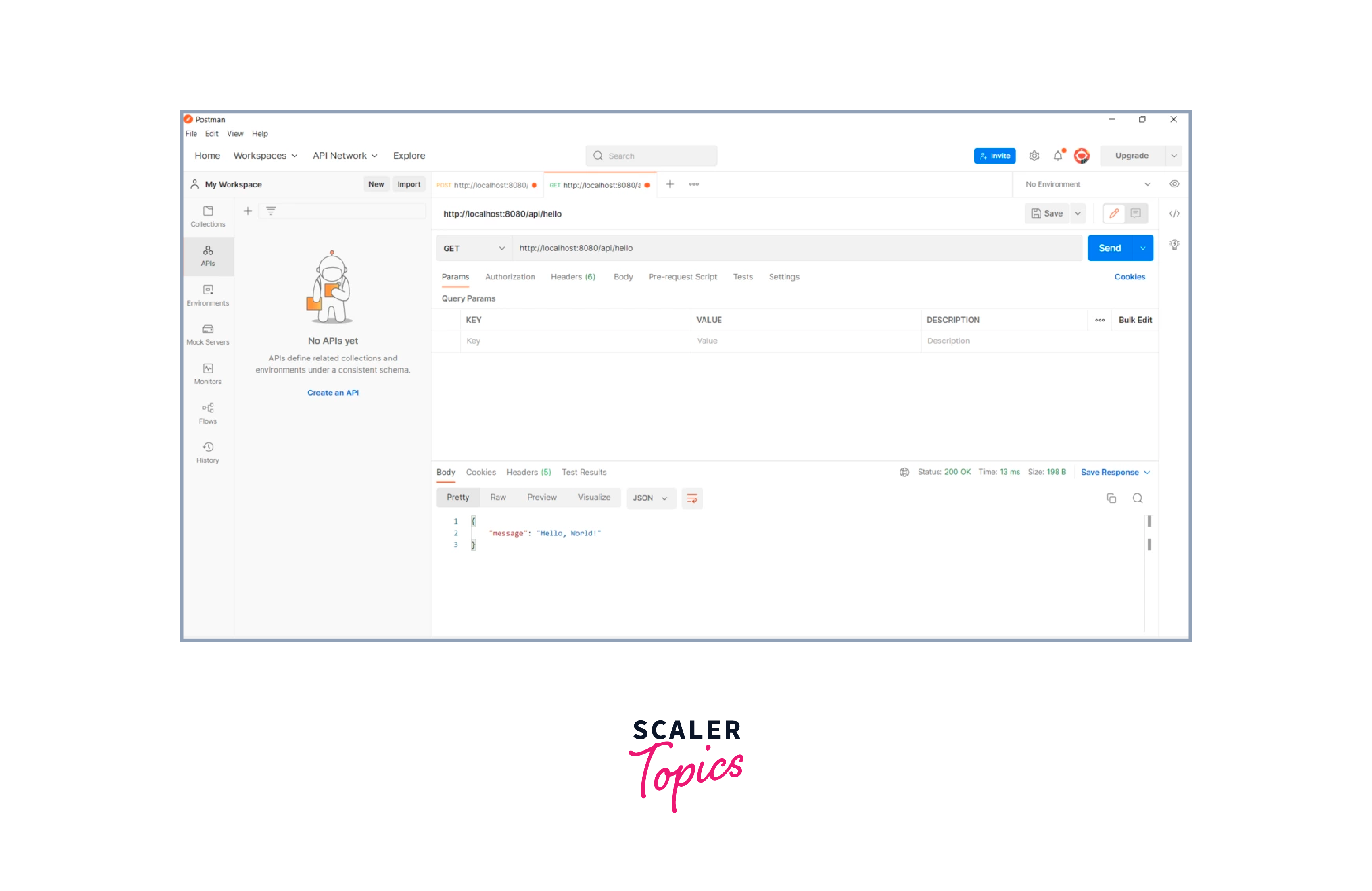 Finally, run the application. The main method in the base class (RestApplication) uses SpringApplication.run() to bootstrap the application, and the embedded Tomcat server will be started. Navigate to http://localhost:8080/api/hello to see the result of the GET method and use tools like Postman or cURL to test the POST method at http://localhost:8080/api/greet.