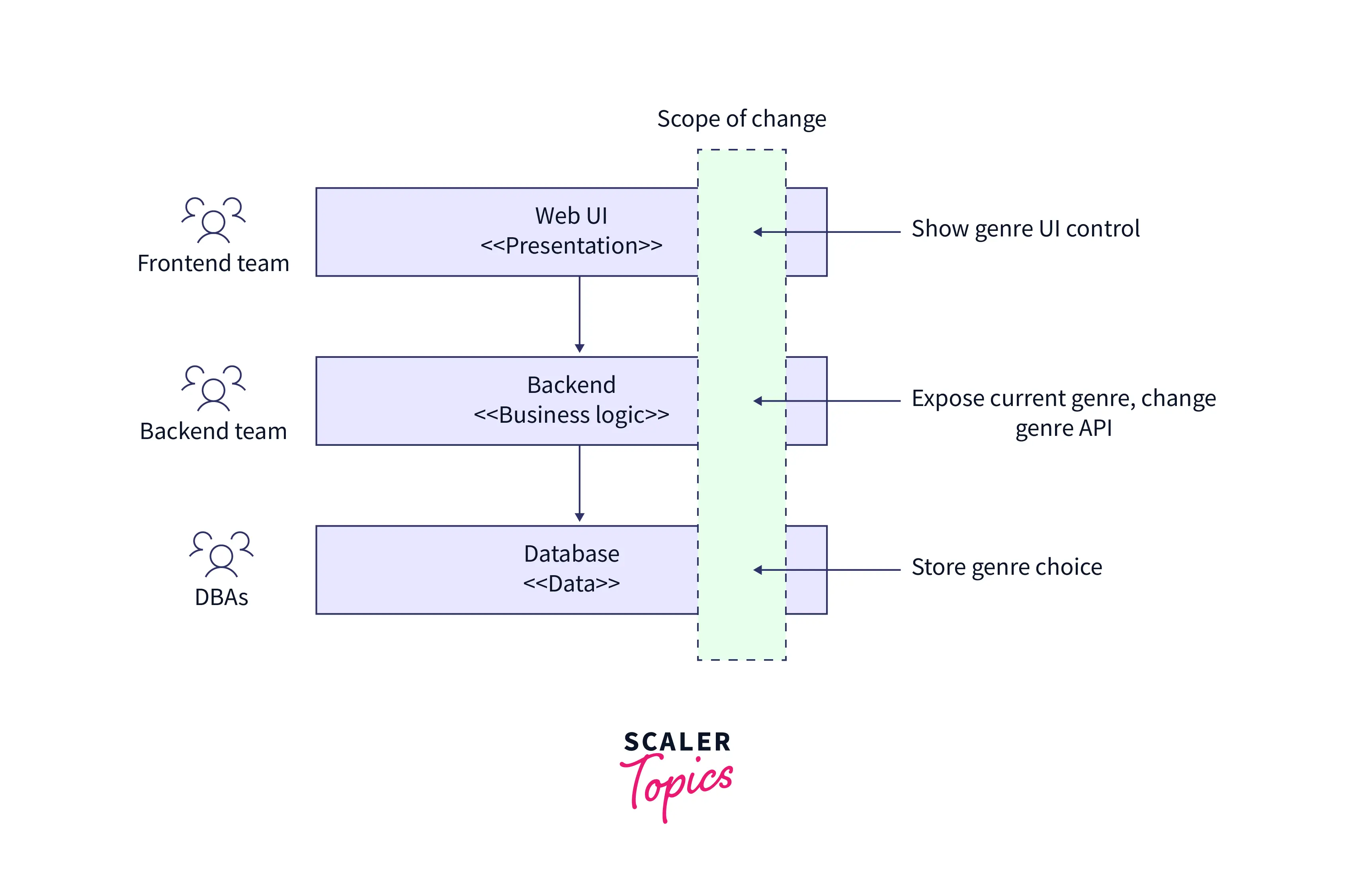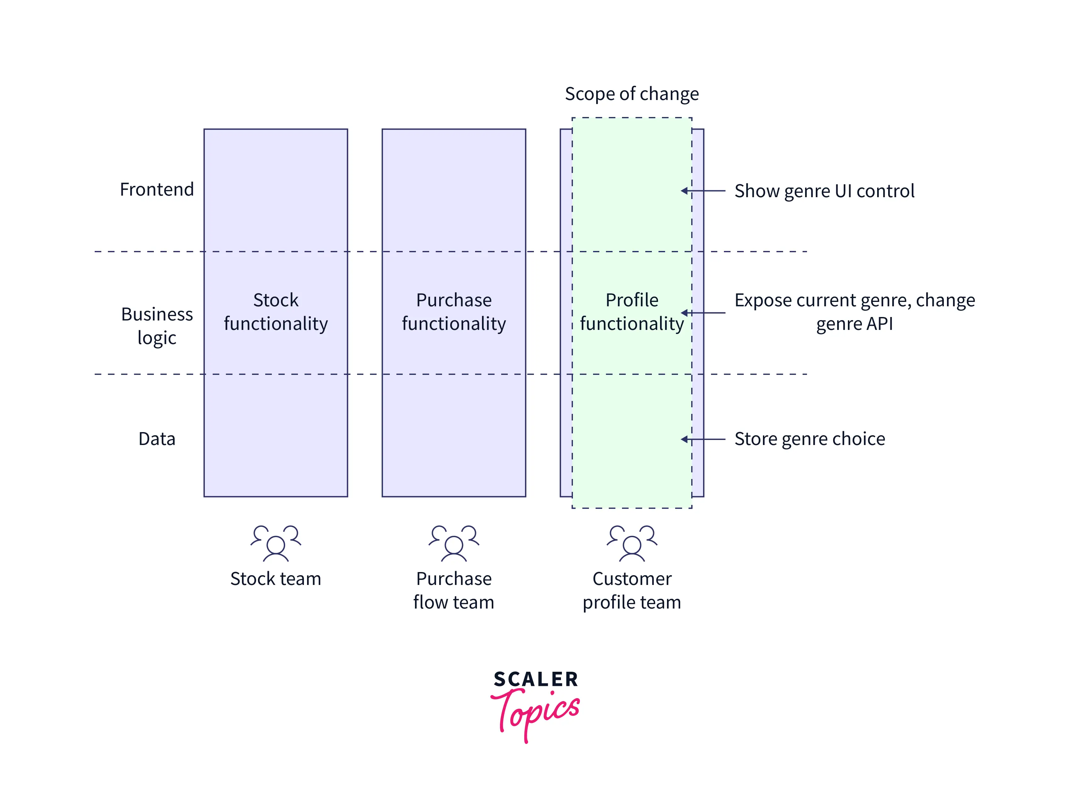As the scope of change is spread across all three tiers, this calls for designing the system based on business functionality where each team is end-to-end responsible for delivering specific business functionality.