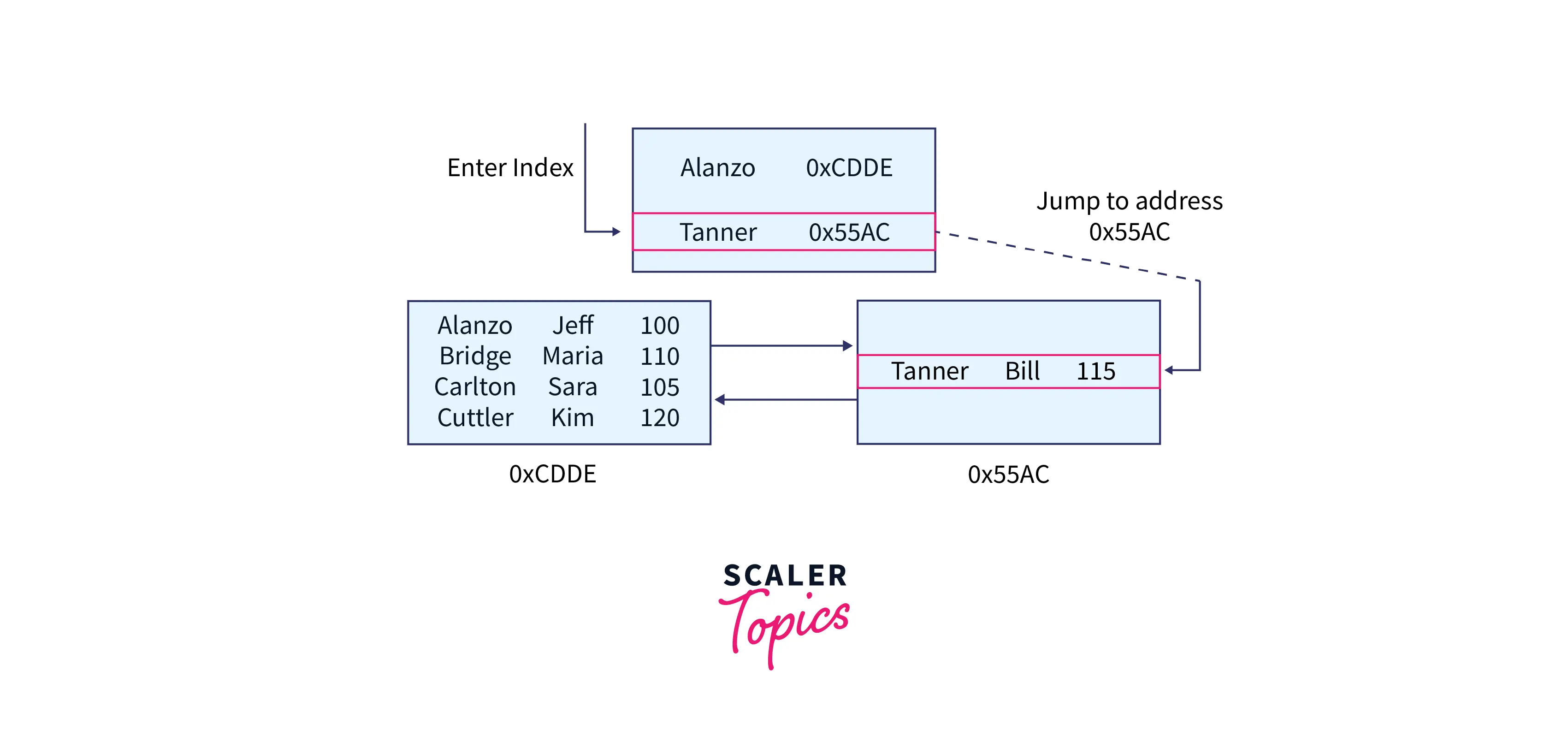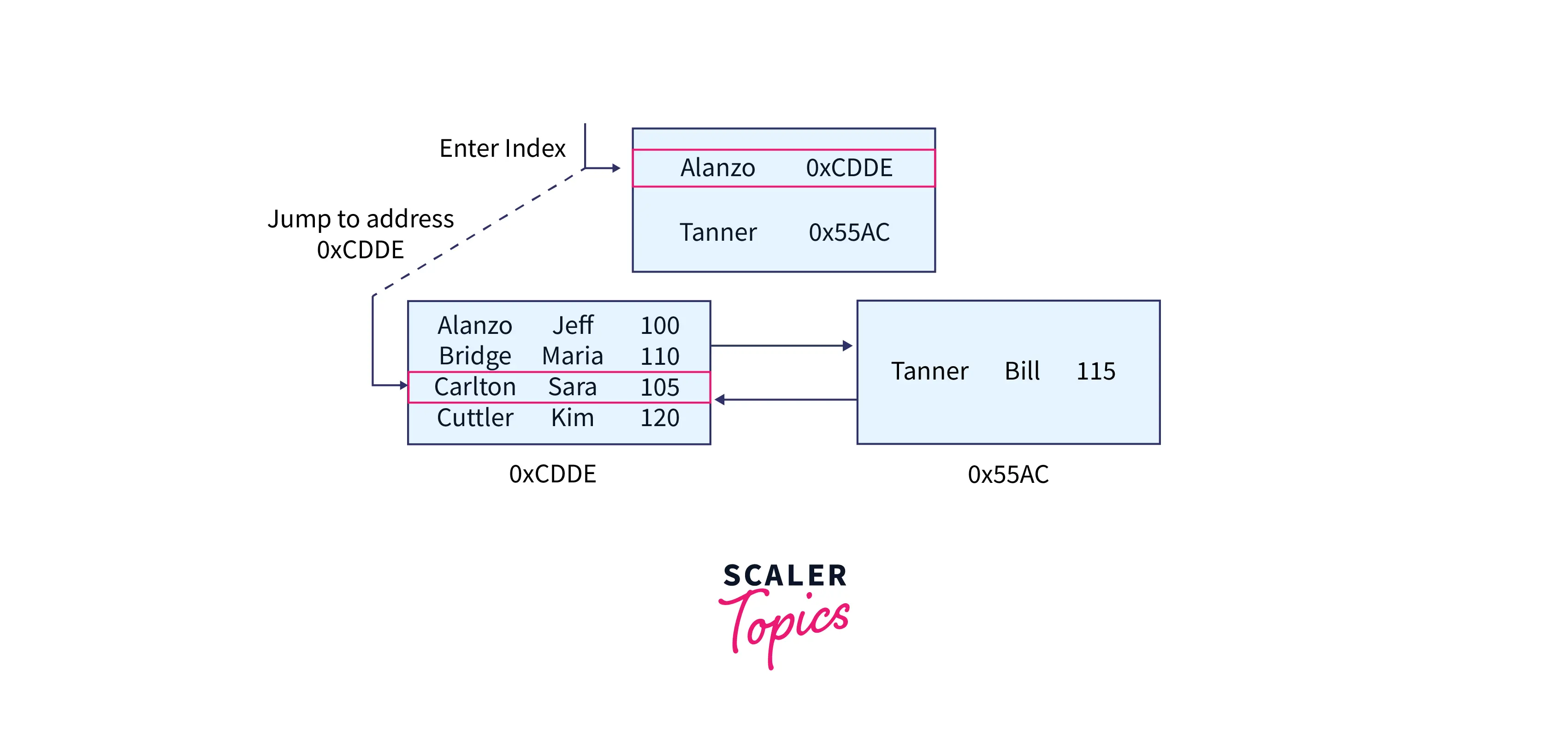 We now know that we must search the node beginning with Alanzo. We need to know the node's address. The root node stores the address of any node beginning with Alanzo. It appears that the node beginning with Alanzo is located at 0xCDDE:
