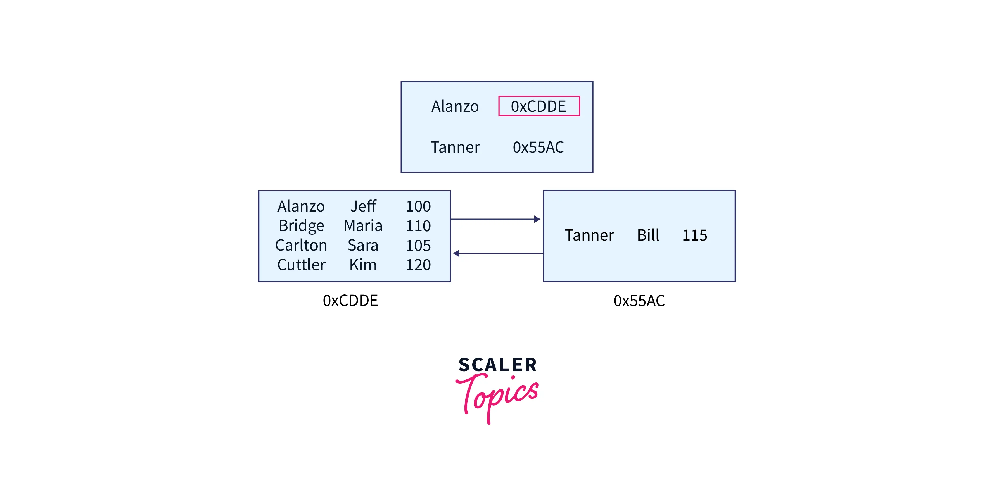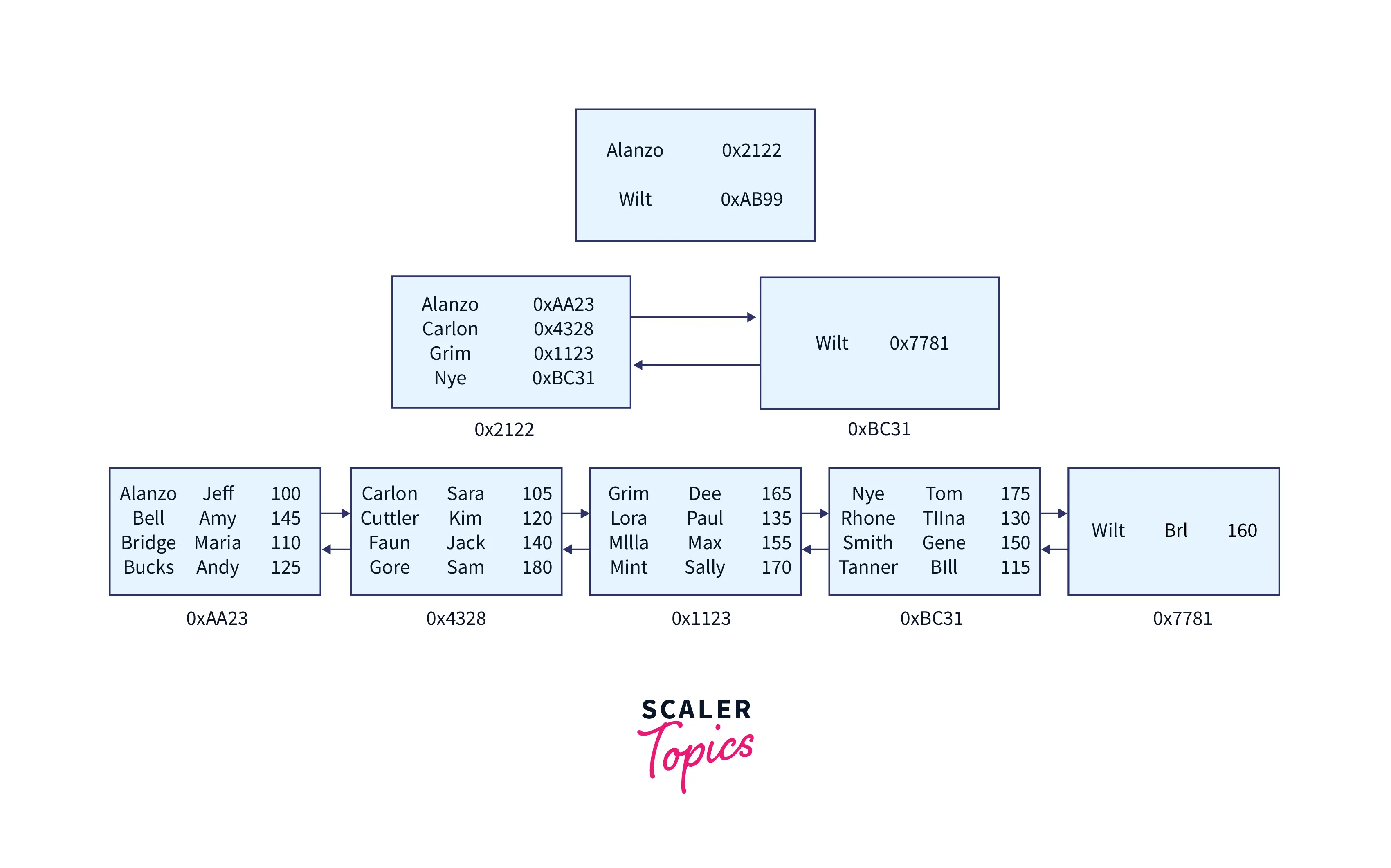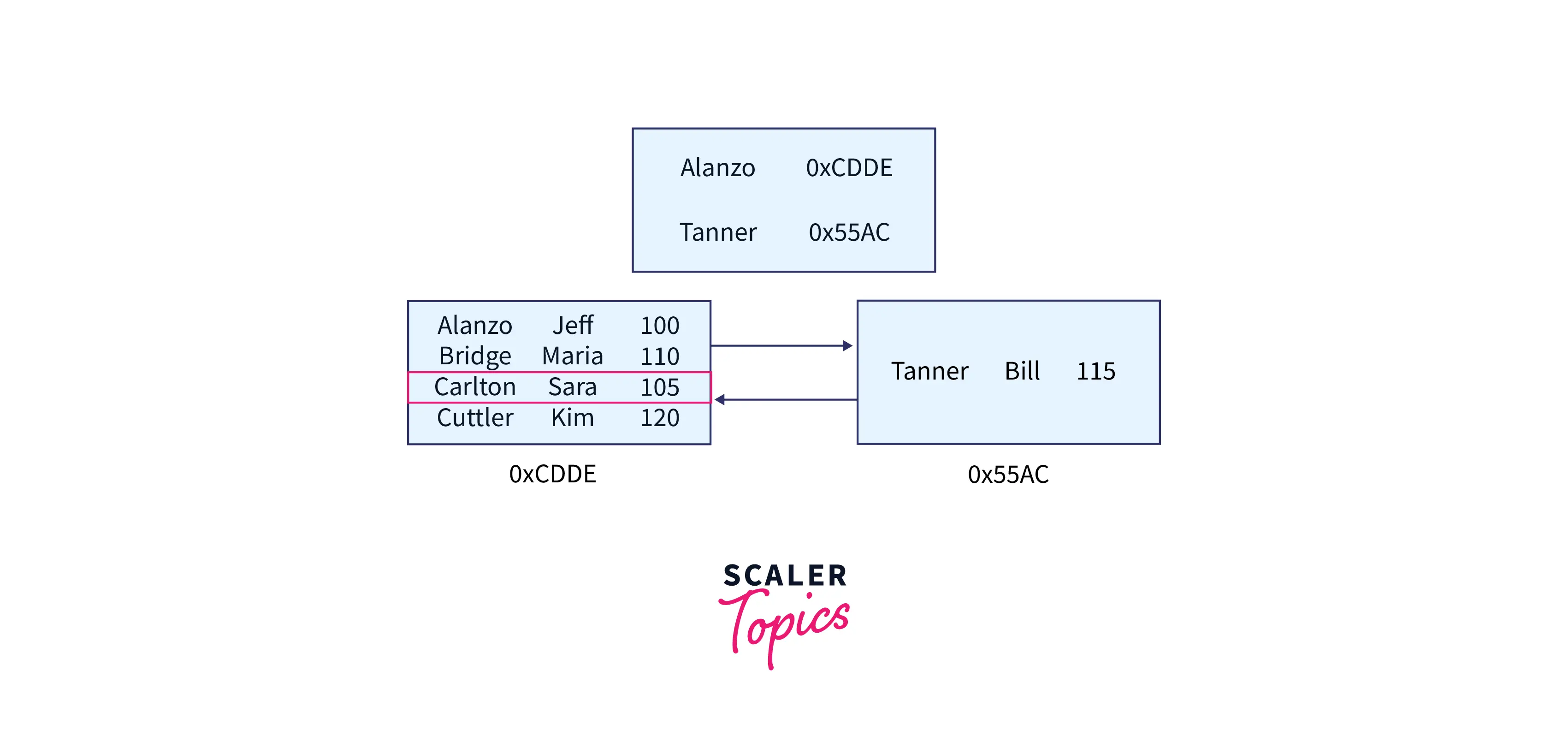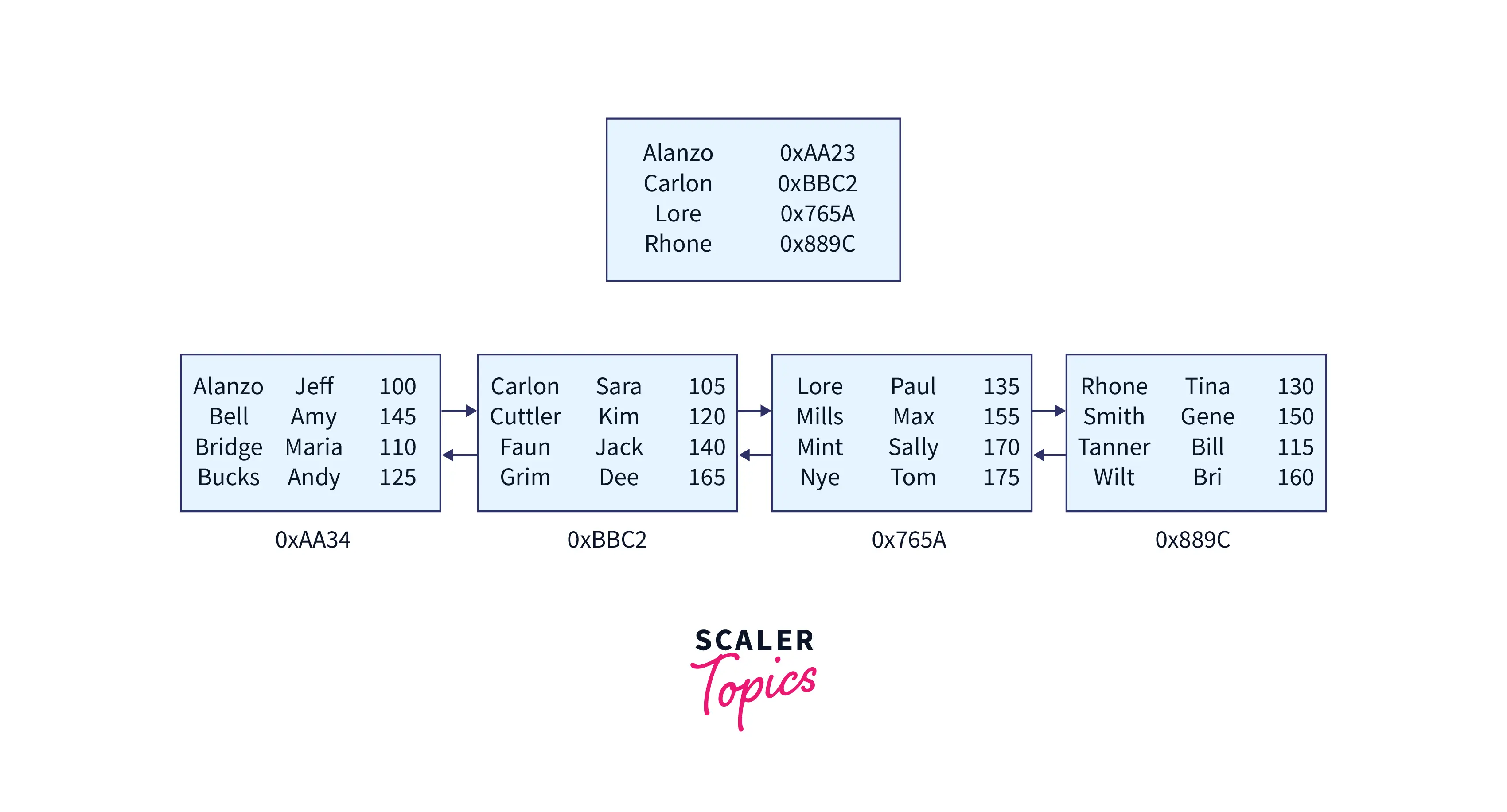 - The two arrows between the two leaf nodes represent how the two leaf nodes are linked using a doubly-linked list. As a result, node 0xCDDE understands how to reach node 0x55AC, and node 0x55AC understands how to reach node 0xCDDE. They are connected to one another in both directions.