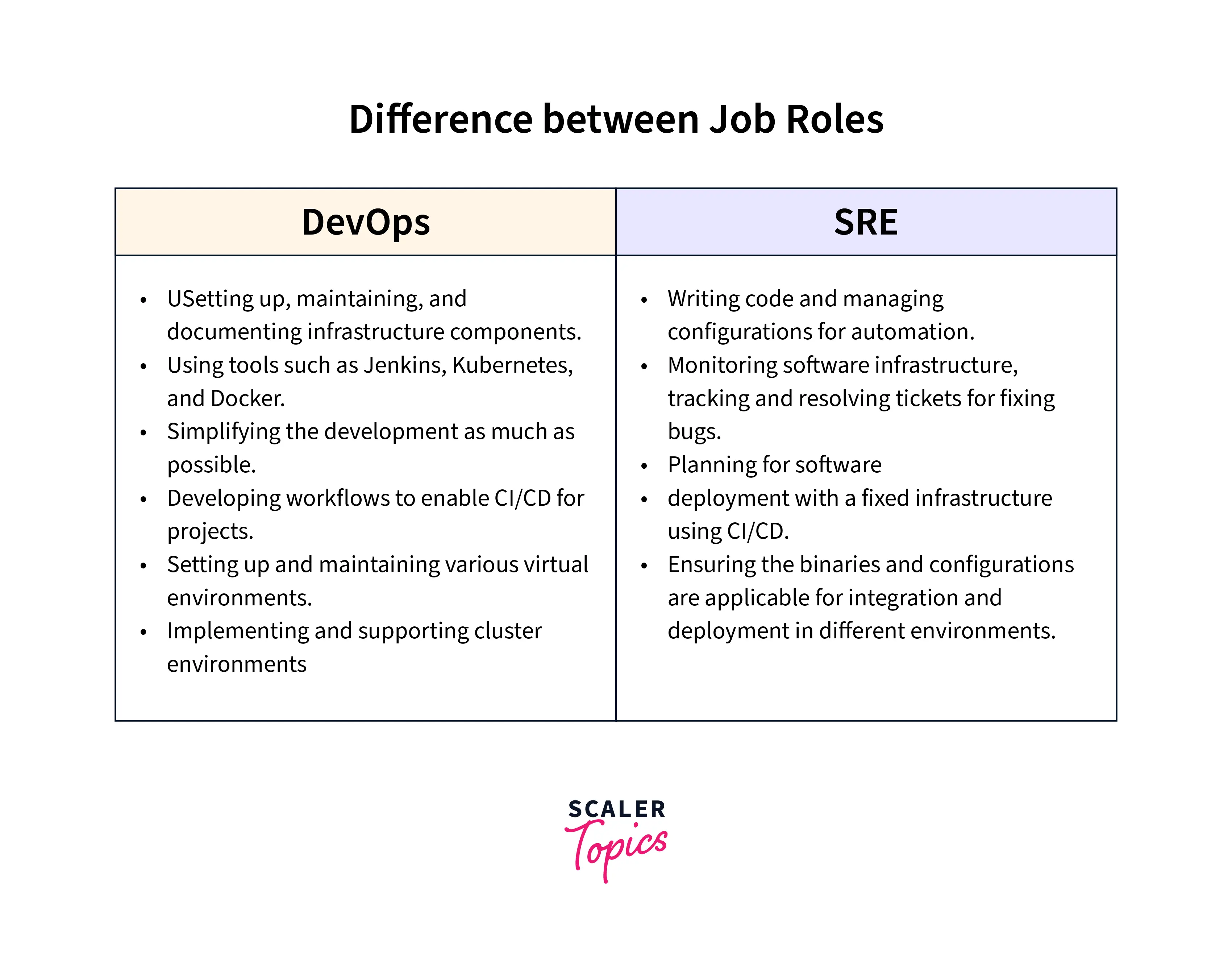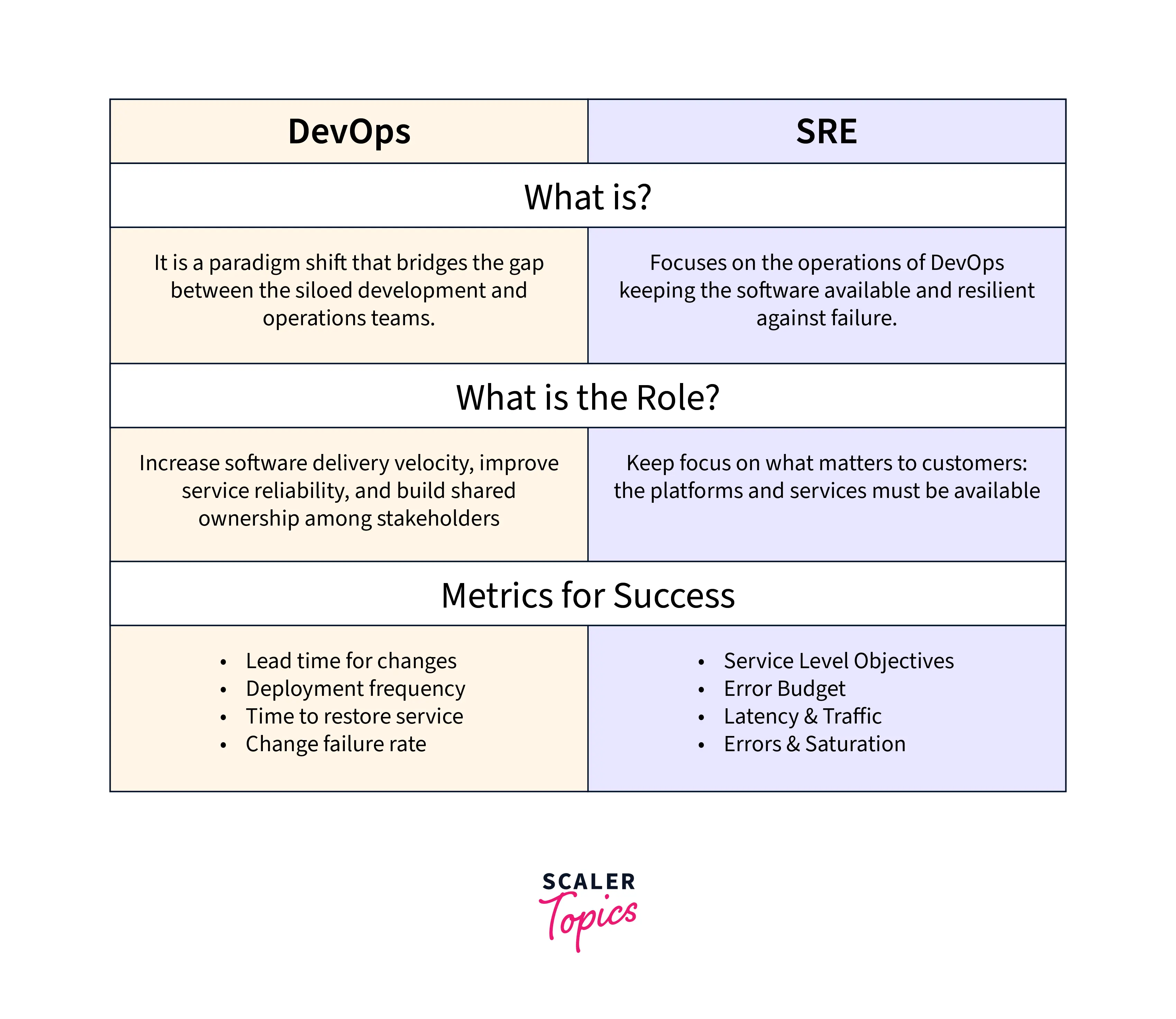 | Process Flow | SREs have a perspective of production, so they can make suggestions to the development team to limit the failure rates despite the new changes. | A DevOps team has a perspective of the development environment to put changes from development to production. |