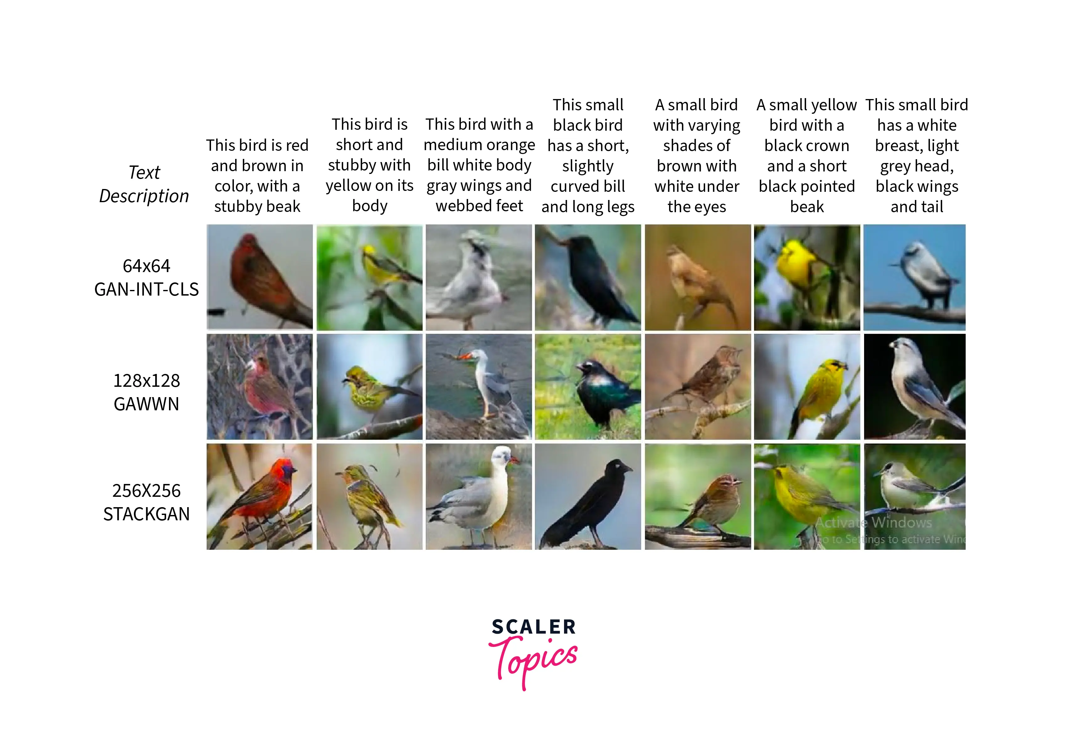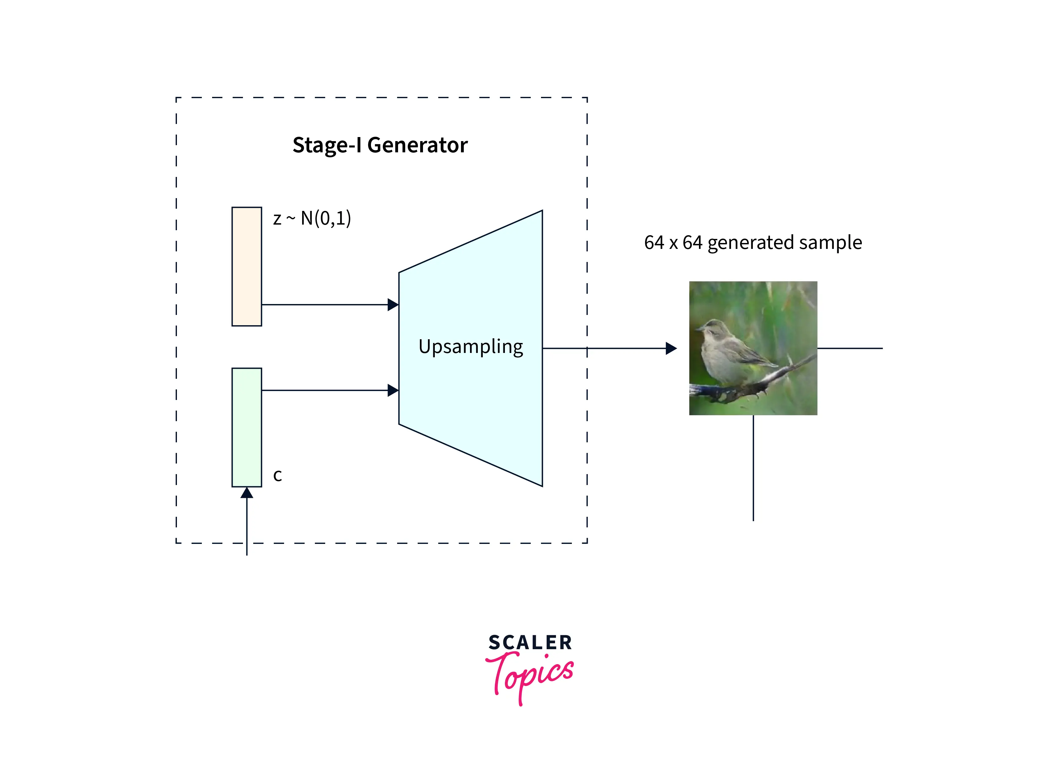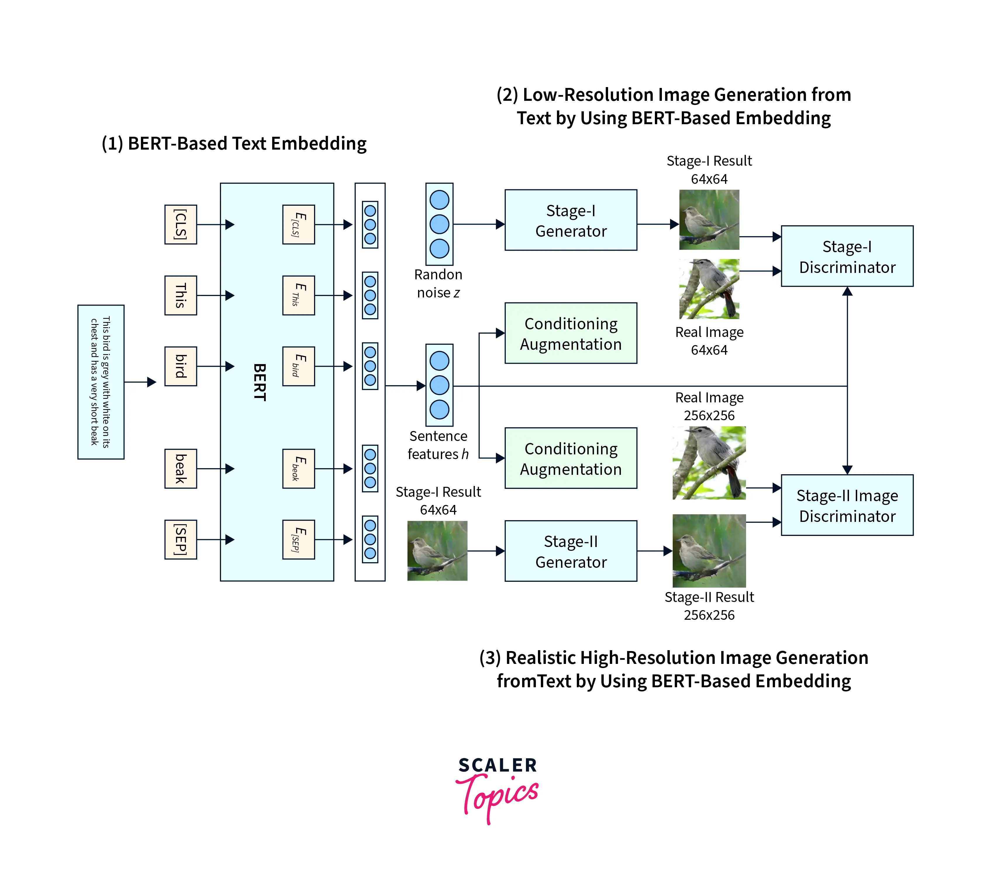 For example, imagine a StackGAN that generates images of birds based on text descriptions. The text descriptions are first converted into text embeddings. These embeddings then generate conditioning variables that guide the image-generation process. The generator network takes in a noise vector and the conditioning variables and produces an output image of a bird.