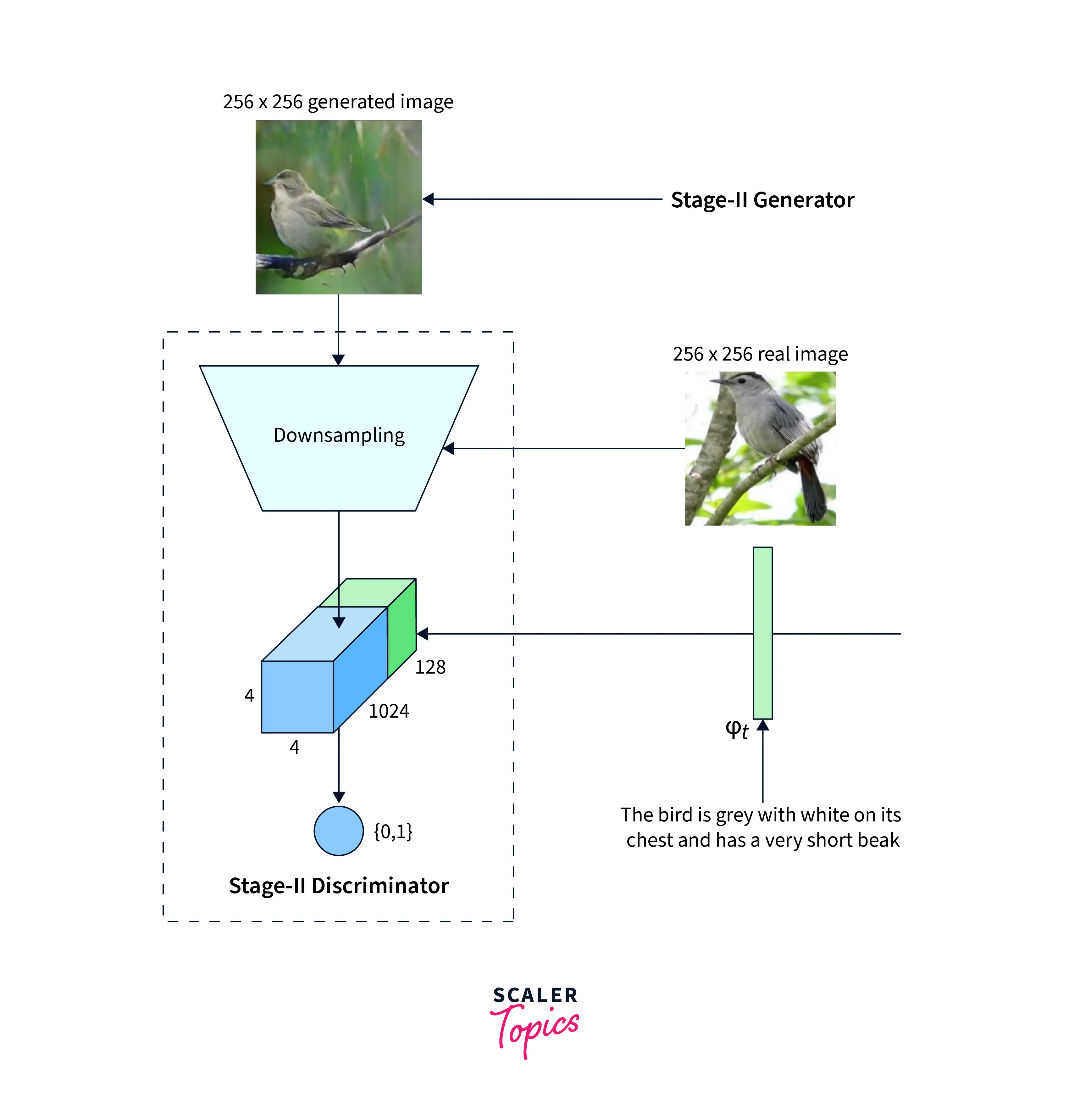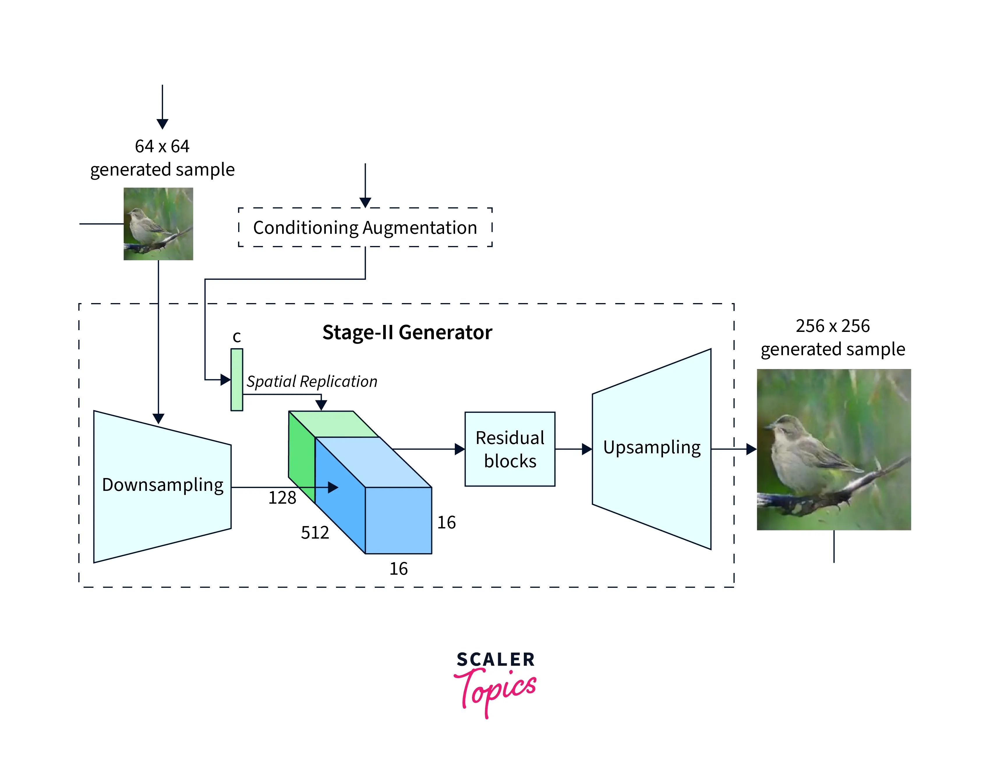 The StackGANs Stage II Generator follows an encoder-decoder architecture with residual blocks. Text embedding is used first to create the conditioning variables. The result of Stage I is passed through downsampling layers and then concatenated with the features obtained from the text embedding. The output of these layers is then upsampled to generate high-resolution images. The Discriminator architecture is almost identical to Stage I, except for a few extra down-sampling layers. These down-sampling layers were included as the output of this part of the network is of a higher resolution than Stage I.