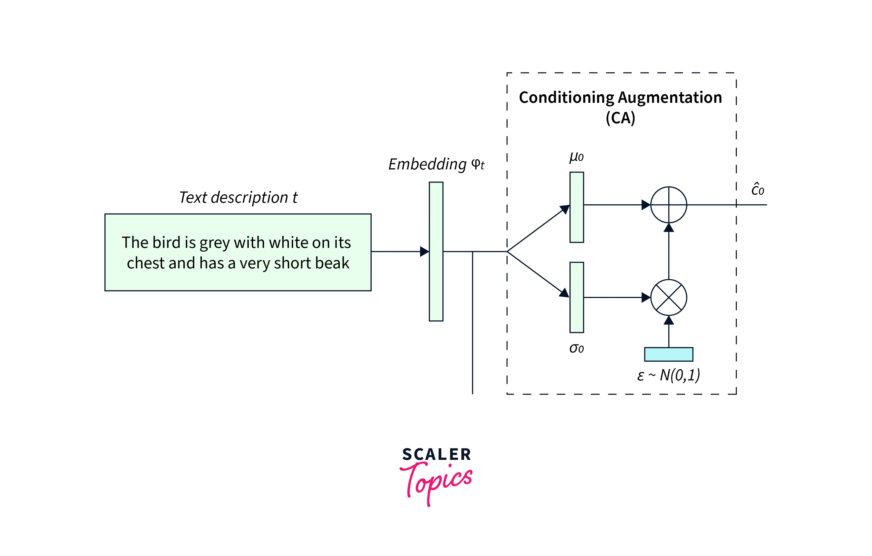 Conditioning Augmentation uses these to create more training pairs from a small subset of data. Instead of using a fixed conditioning variable, StackGAN samples latent variables from a Gaussian distribution. The mean and covariance matrix is generated for a text embedding .