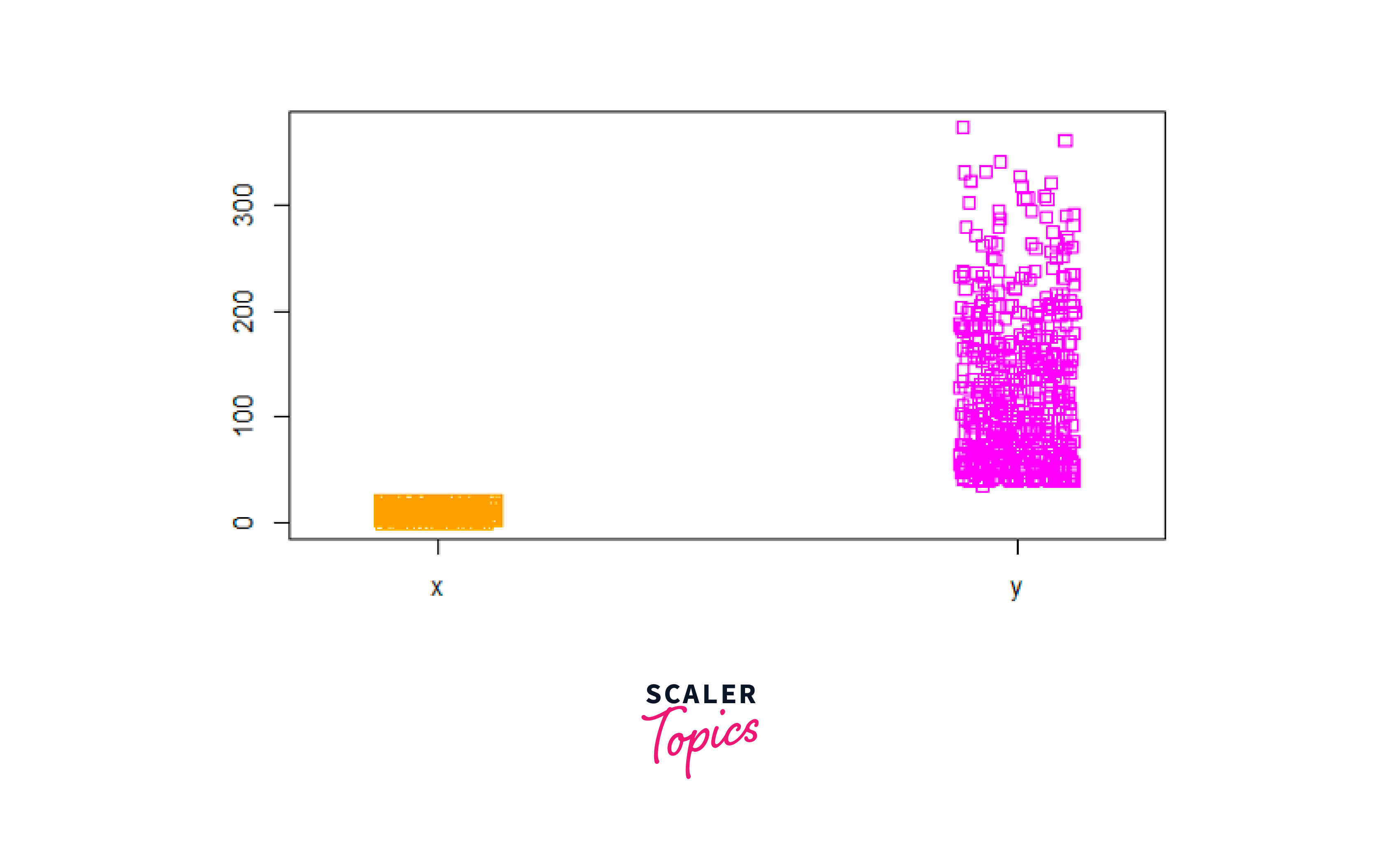 Here we created a new list named list_new with two elements. The 'Time' variable from the ChickWeight dataset is stored in list_new$x, and the 'weight' variable is stored in list_new$y. Then we created a vertical strip chart using the stripchart() function with the list_new list as the input. We also used the col parameter inside the stripchart() function to set the colors for the two strip charts.