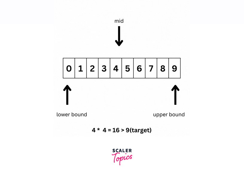 Similarly, if the target is greater than the square of mid, then we can discard checking all the numbers less than mid along with mid by making the lower bound as mid+1.