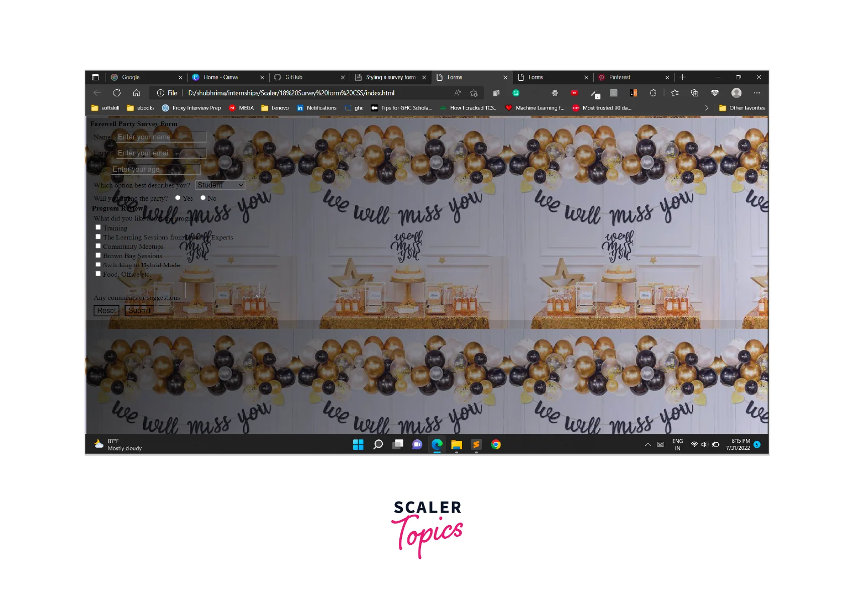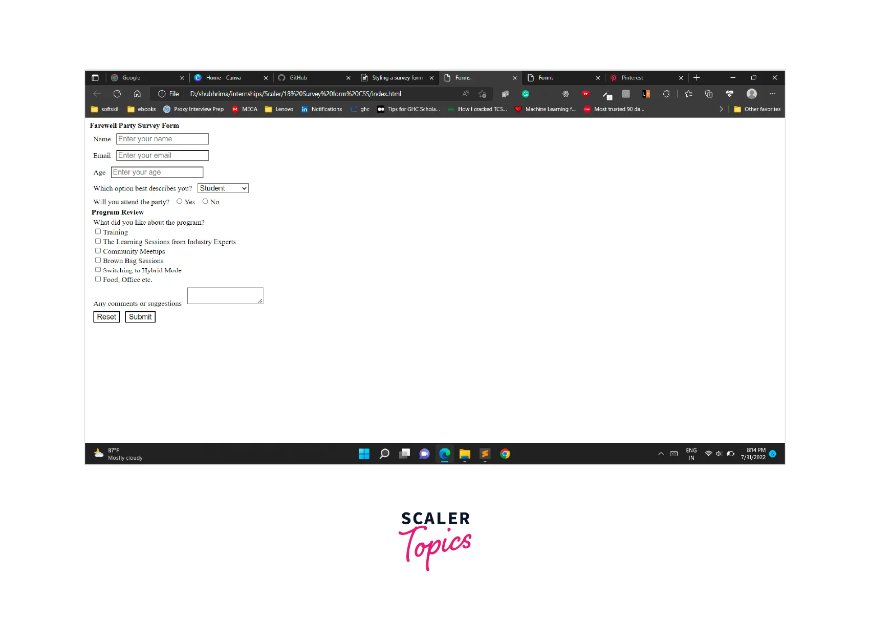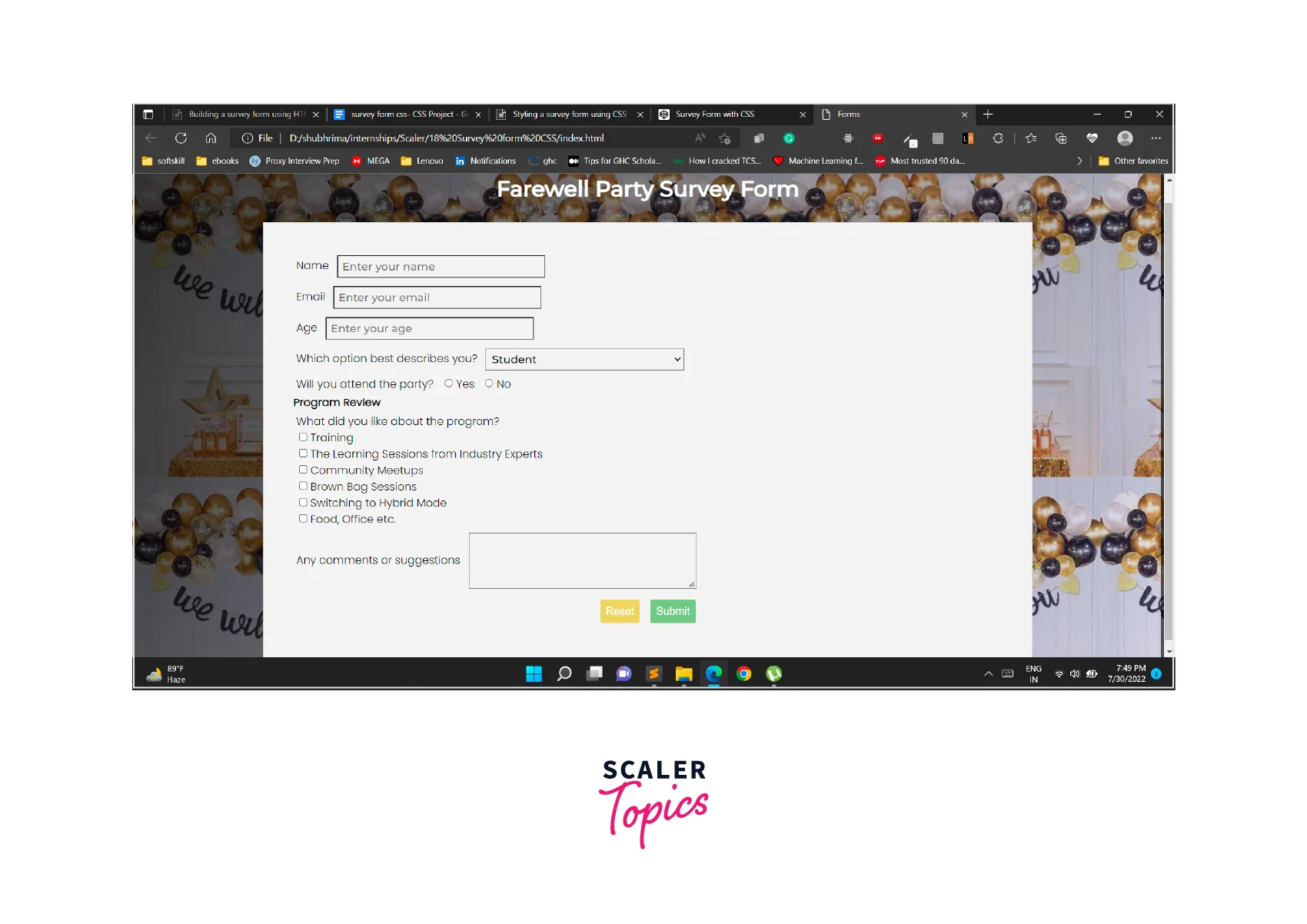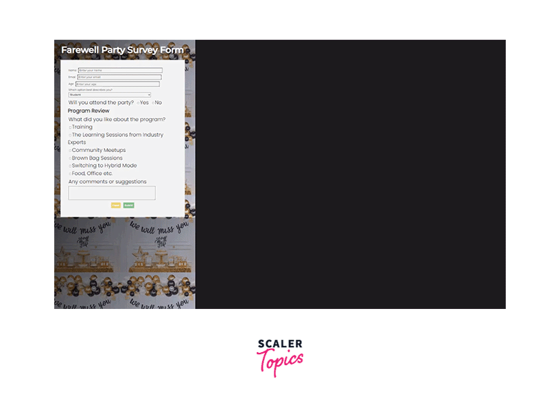 In this article, we'll learn how to design our survey form project from scratch. All the elements in the form can be styled with text decoration, text color, background color, text alignment, margin, padding, etc. using basic CSS.
