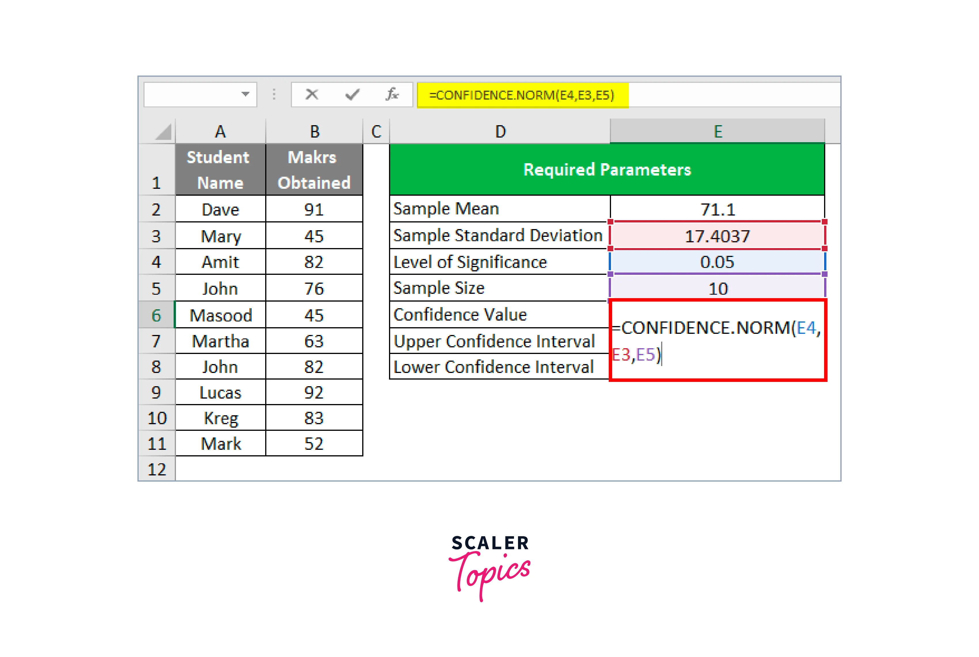 Use a new cell to enter the confidence formula once you have all of the formula's values. Write "confidence value" in a new cell under "alpha value" in column B, and then enter the formula corresponding to column C. Each value is listed in a separate cell, so the formula may use the cell labels. This would read =CONFIDENCE with the sample size in cell C2, the standard deviation of in cell C4, and the alpha value of in cell C5 (C2, C4, C5). A confidence value of can be obtained by typing in the numeric values, which would read as =CONFIDENCE(0.04,14,38). -