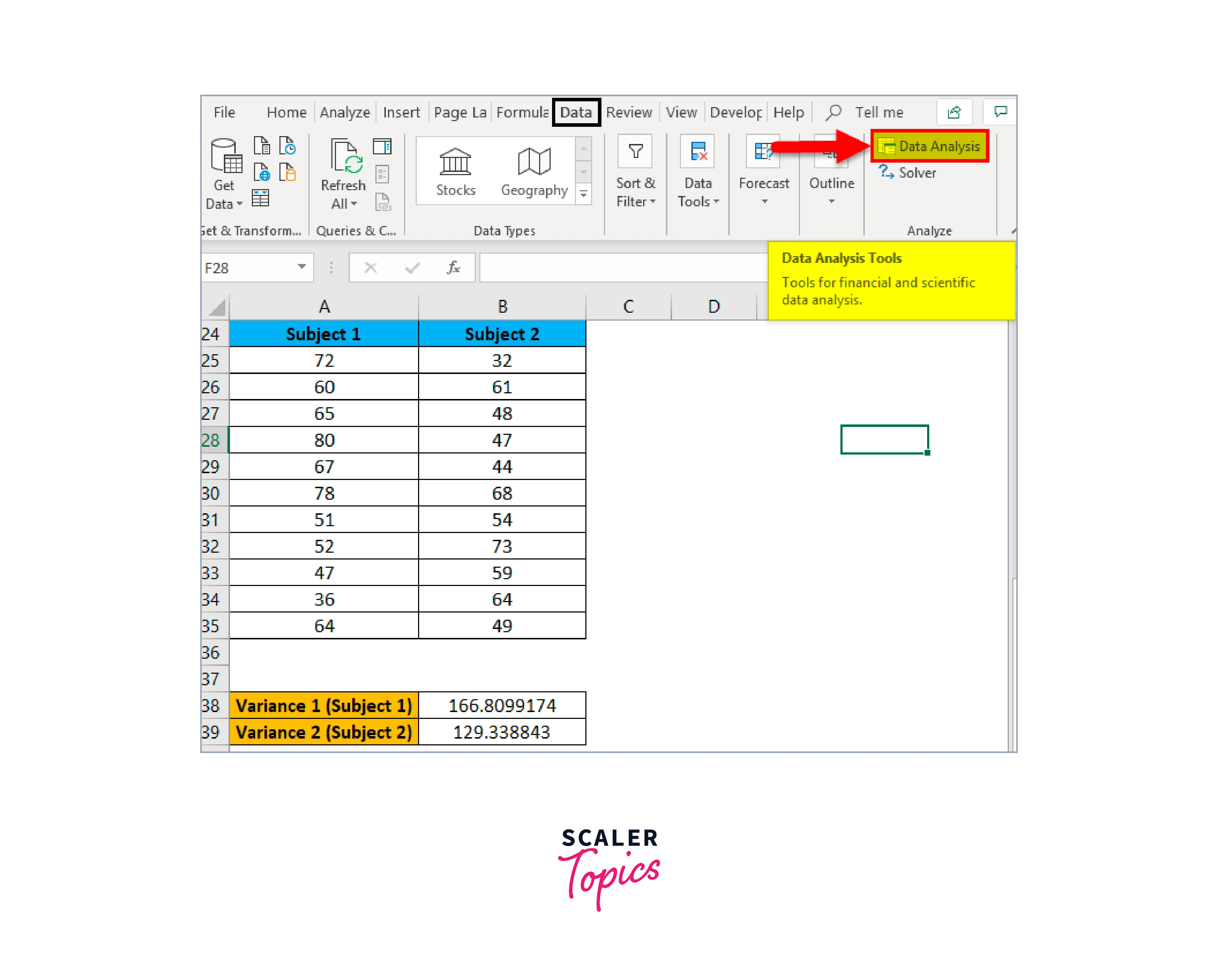 Now, select the DATA tab and then select the Data Analysis tab, as shown in the screenshot below: