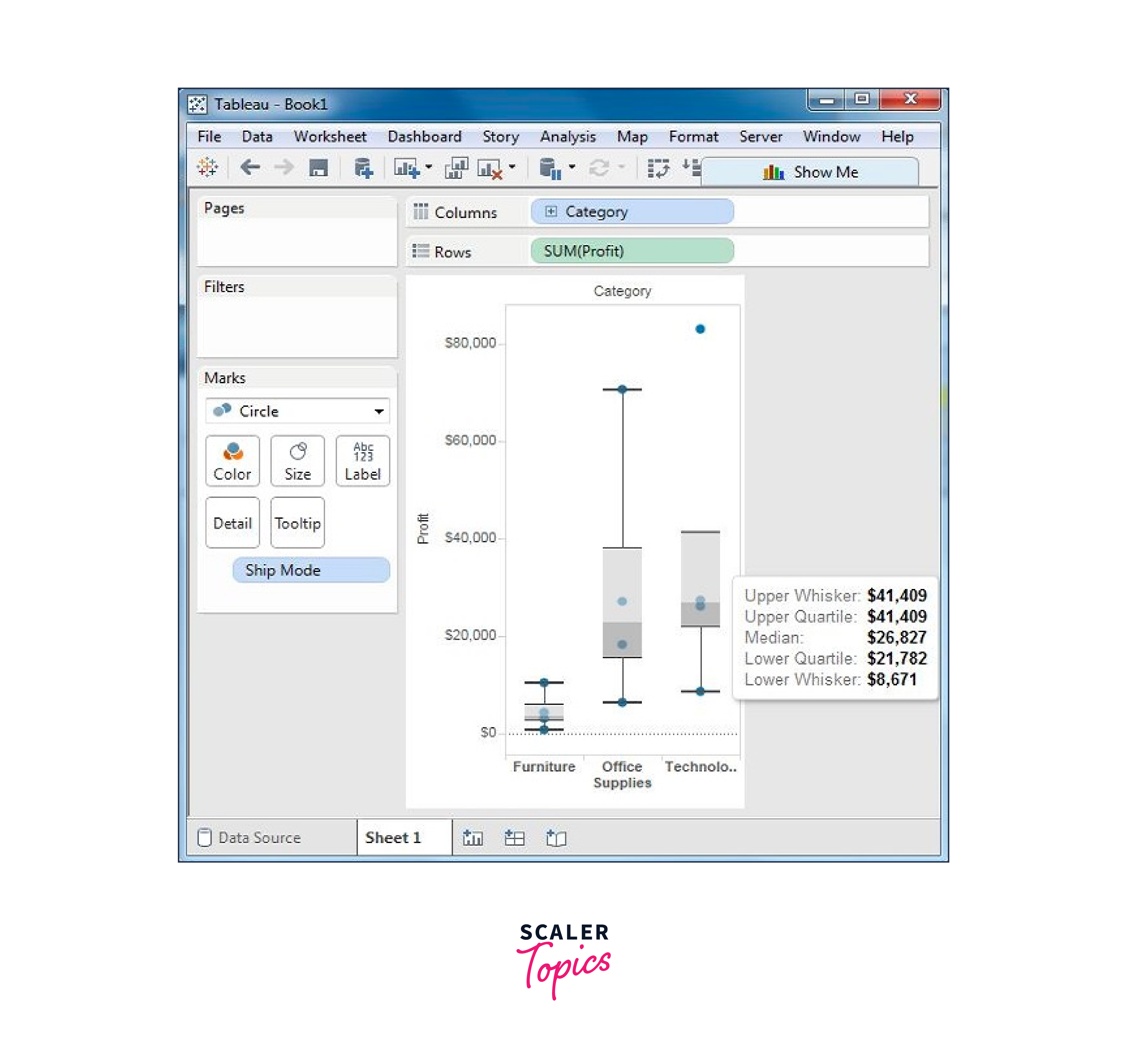 - Add Box Plot: In the "Marks" card, change the mark type to "Box Plot." Tableau will automatically generate the box plot based on the data.