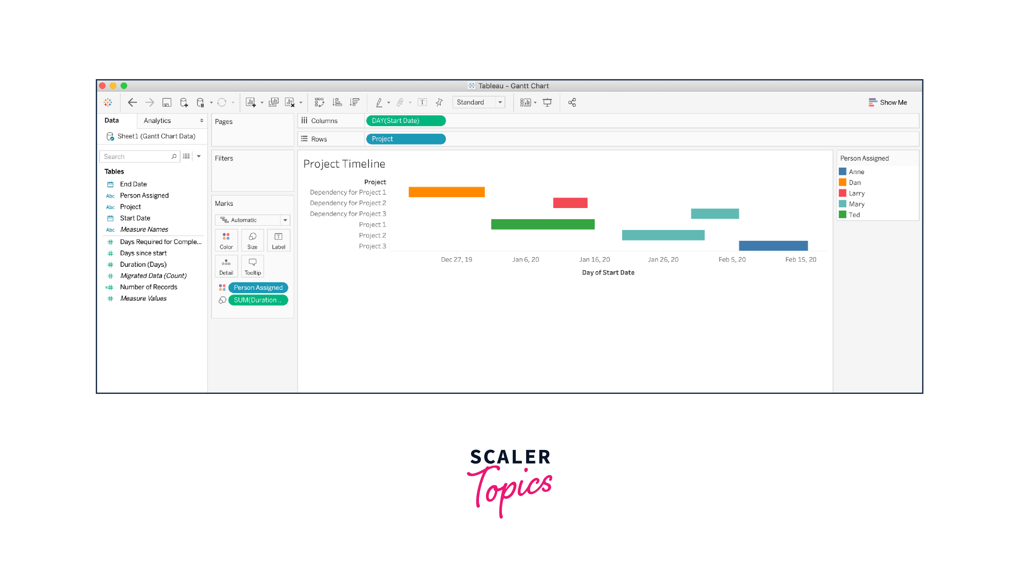 - Data Preparation: Load your project data into Tableau, including tasks, start dates, end dates, and dependencies.