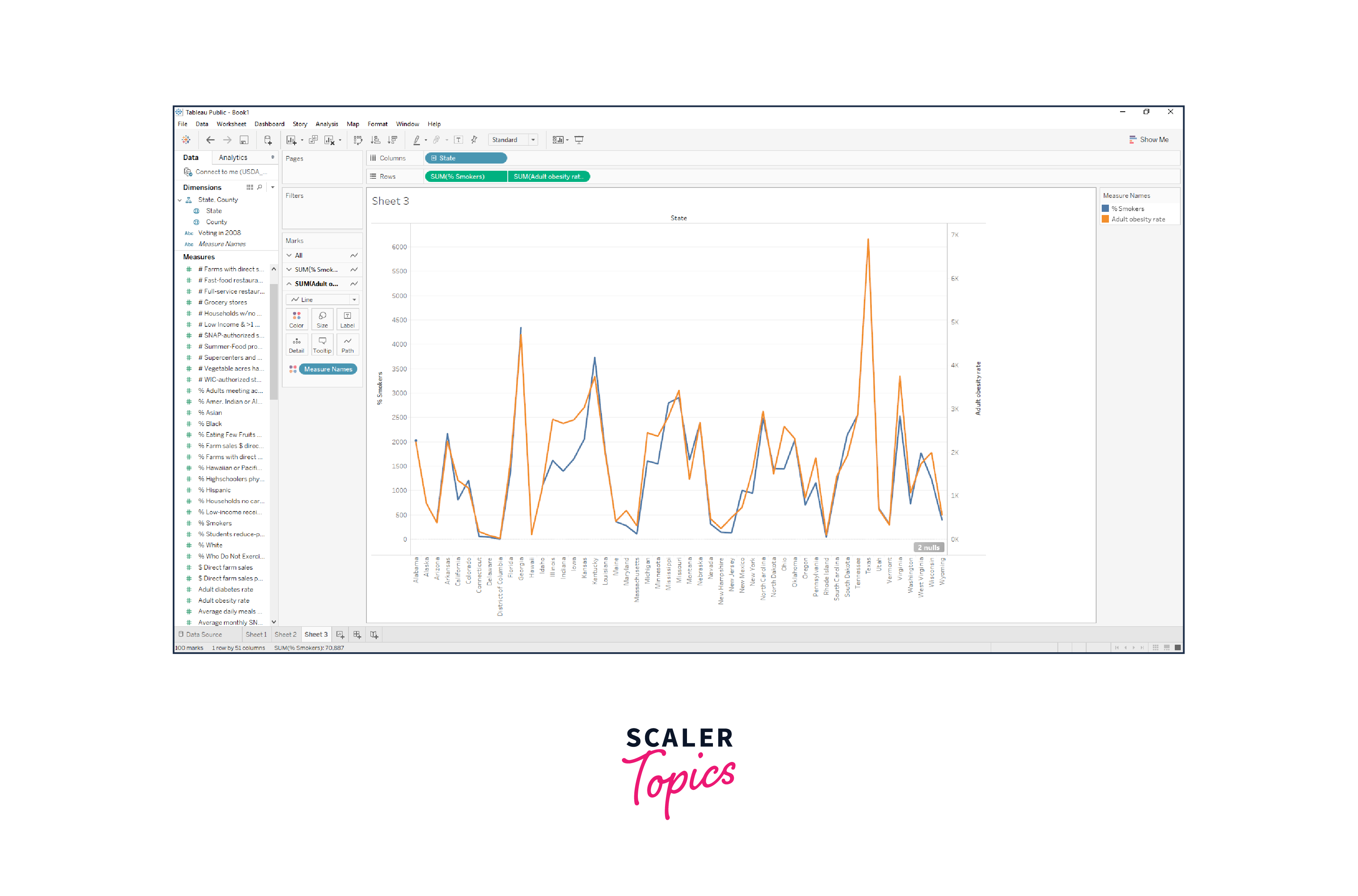 - Multiple Lines: To visualize multiple data series, drag additional measures to the Rows shelf, creating multiple lines on the same chart.