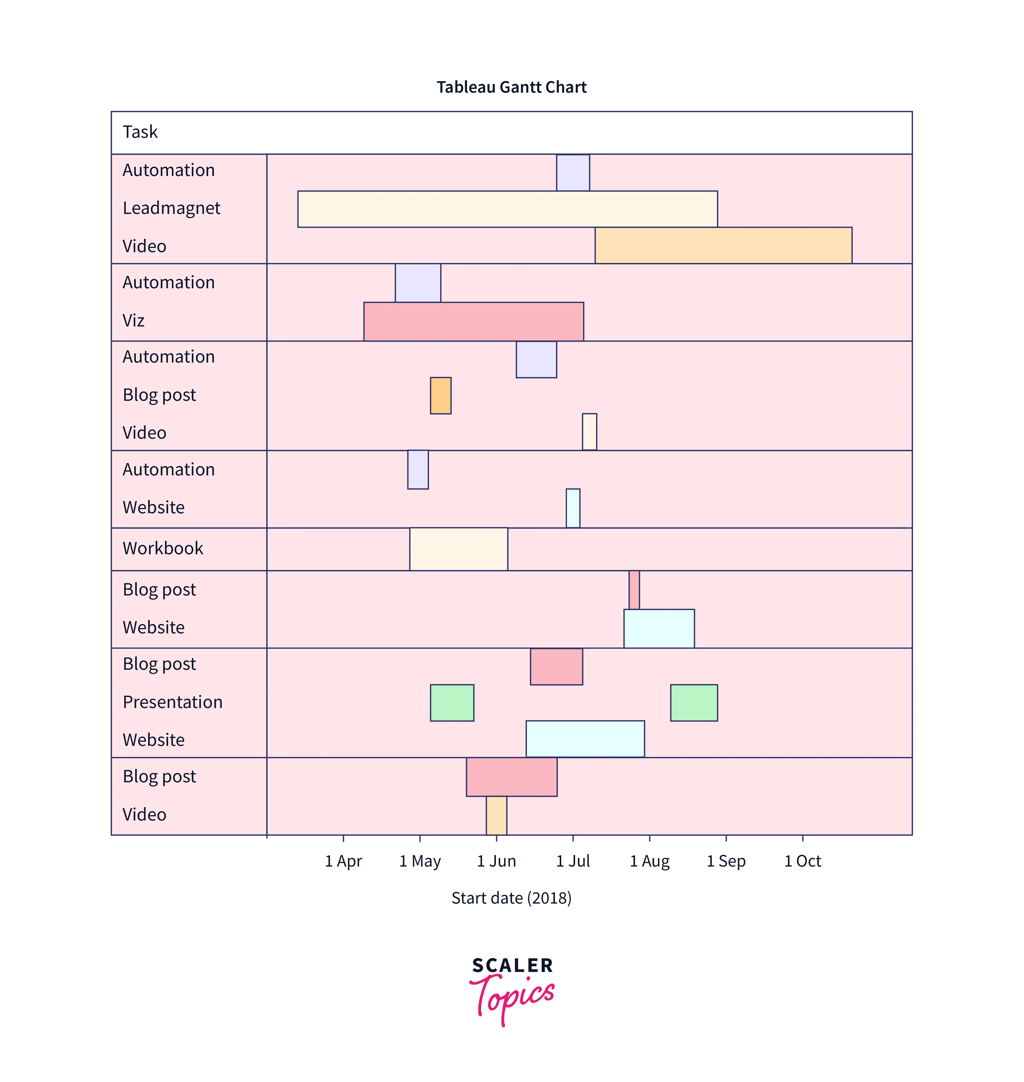 A Gantt Chart is a form of Tableau data visualization which is used to show project timelines and timetables. A Gantt chart is a chart that shows the numerous activities and milestones in a project, with horizontal bars representing the time of each work and its dependencies. This lets viewers swiftly assess a project's progress and detect potential bottlenecks or delays.