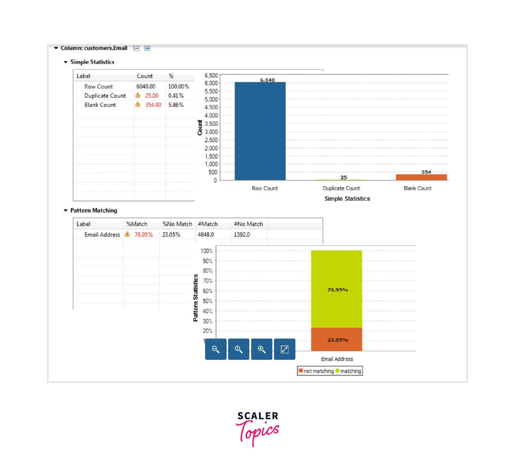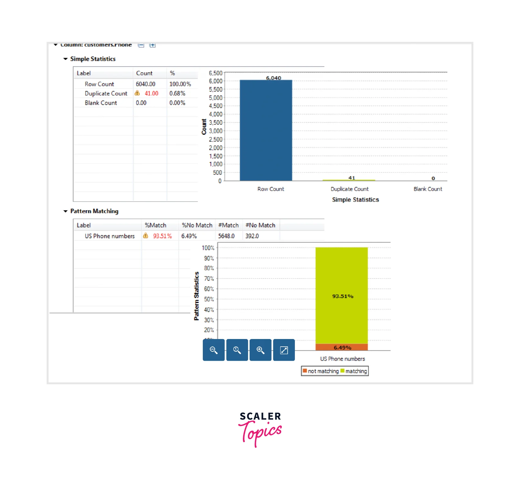 With the help of pre-specified patterns, users can identify any records that are not following the standardized format for the phone number or email by matching the content. This helps to identify the content, structure, and quality of phone numbers and emails. The percentage of data that matched or did not match the standard formats can be identified.