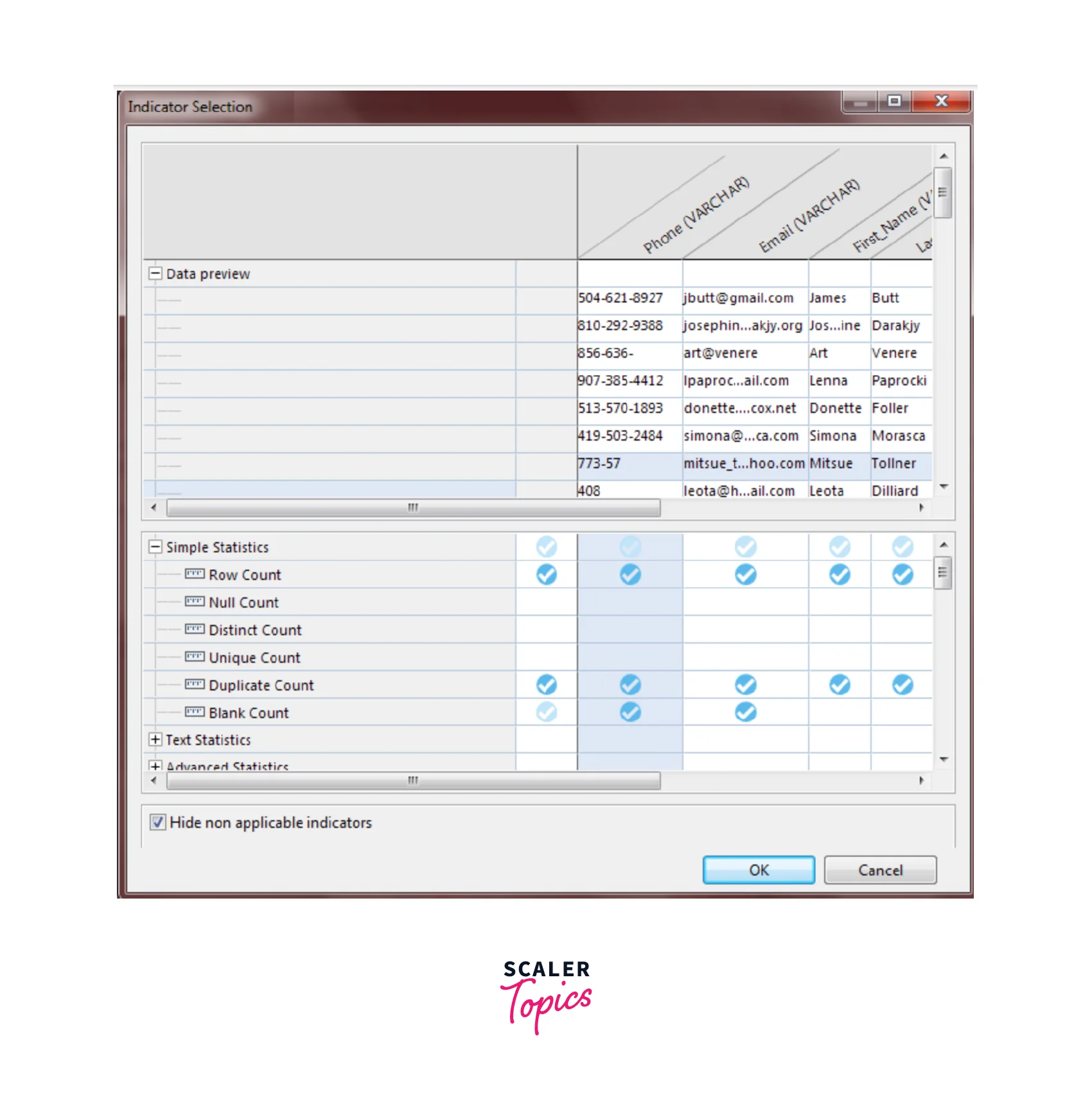 - With the help of the indicators, users can see statistics of the data like blanks, row count, or duplicate count.