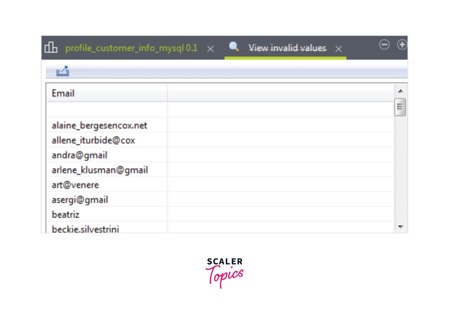 - Users can view the invalid values in the Email column, by selecting Pattern Matching of the Email column in the Analysis Results.