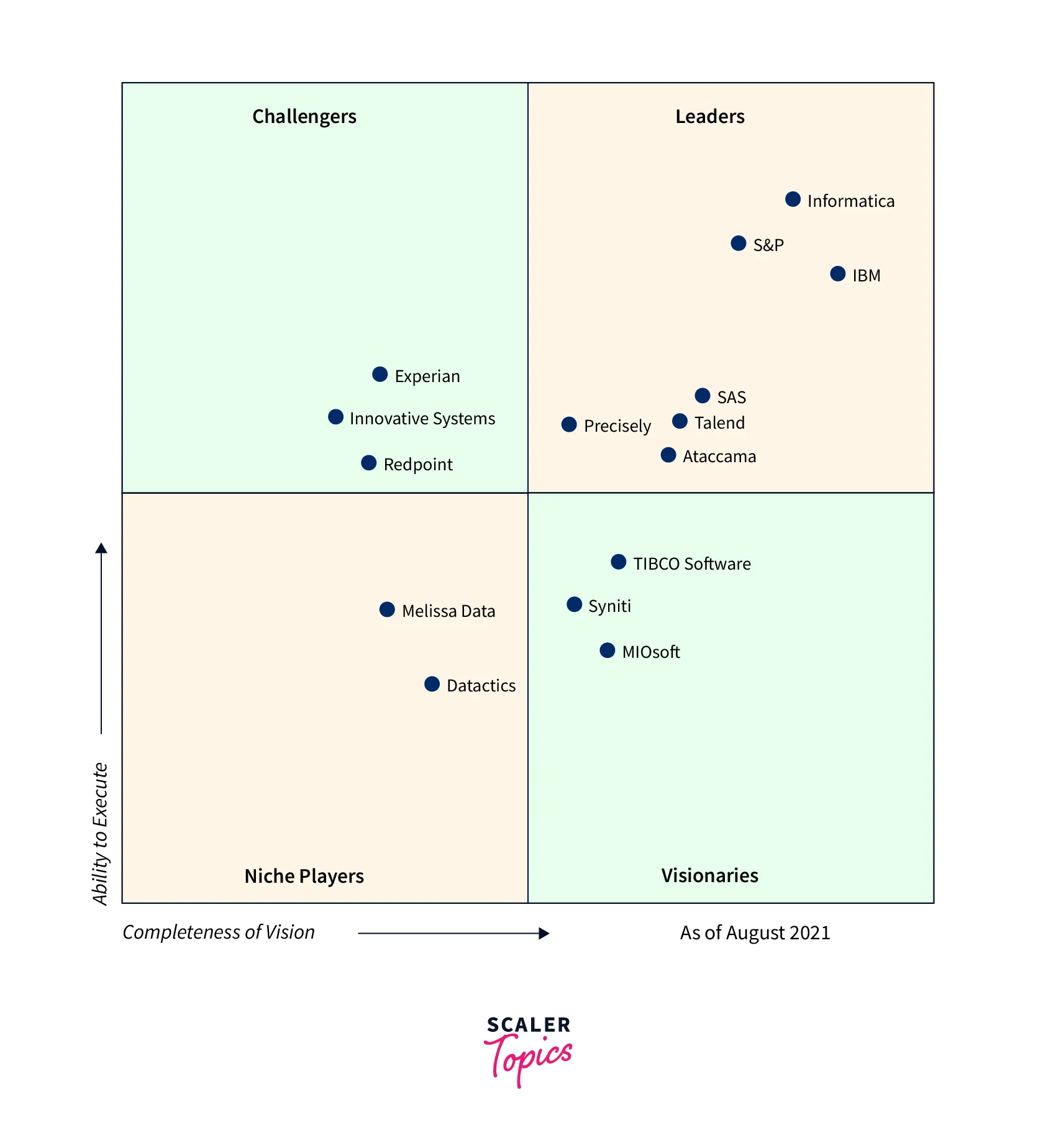 Connecting with various other known platforms like HortonWorks, MapR, Cloudera, Amazon EMR, and even Apache can be easily achieved with the help of the plugins offered. Research from Gartner also suggests that Talend's big data platform falls in the Leader magic quadrant for Data Integration tools as seen below.