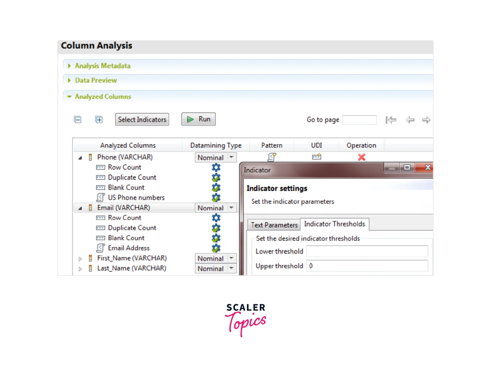 - Users can select the settings icon and set thresholds on the Email and Phone columns. The threshold can be set as 0 in the Upper threshold field. This writes the values in red color for the count of the duplicate and blank values in the analysis results.