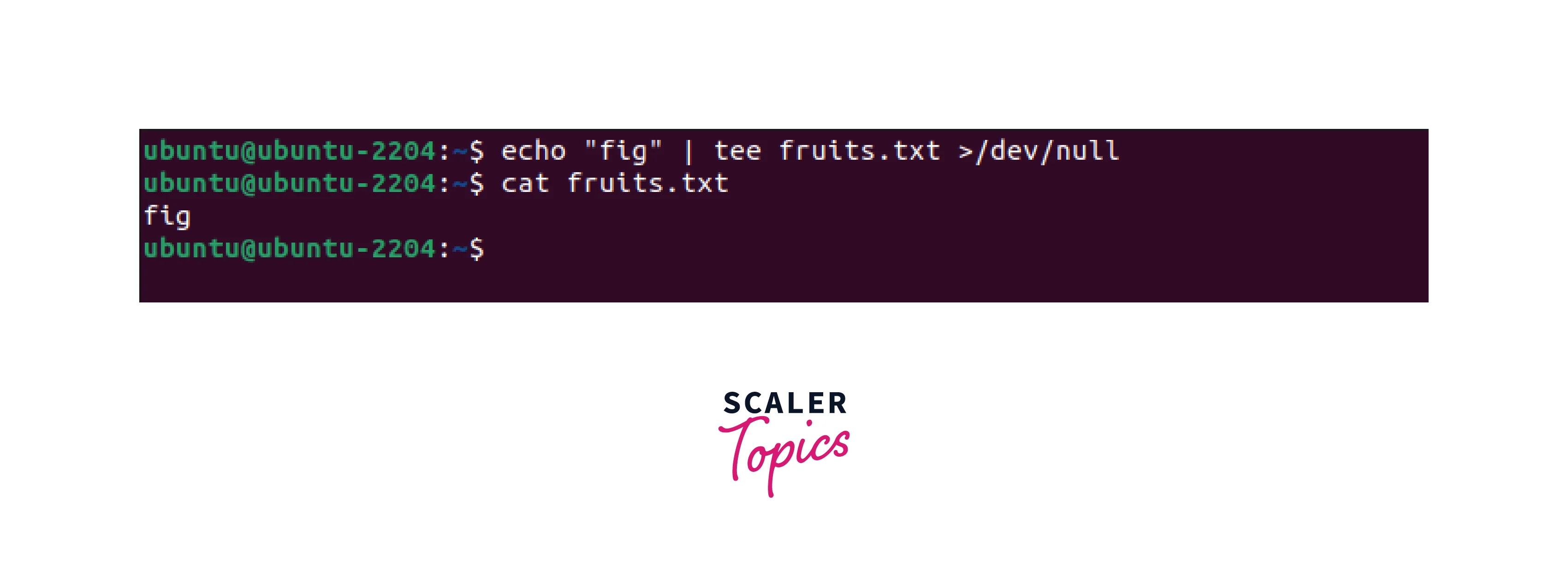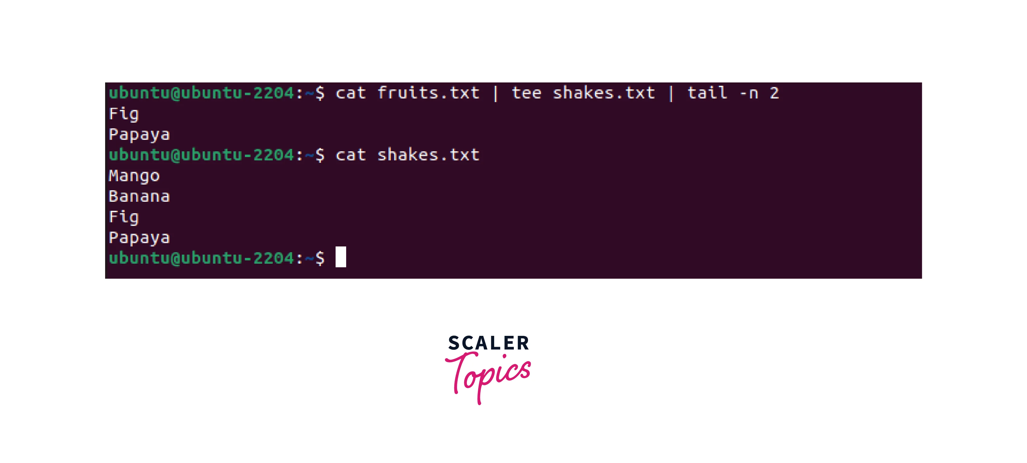 In the above example, the tee command is used to redirect the output of the echo command to the files, fruits.txt and shakes.txt.