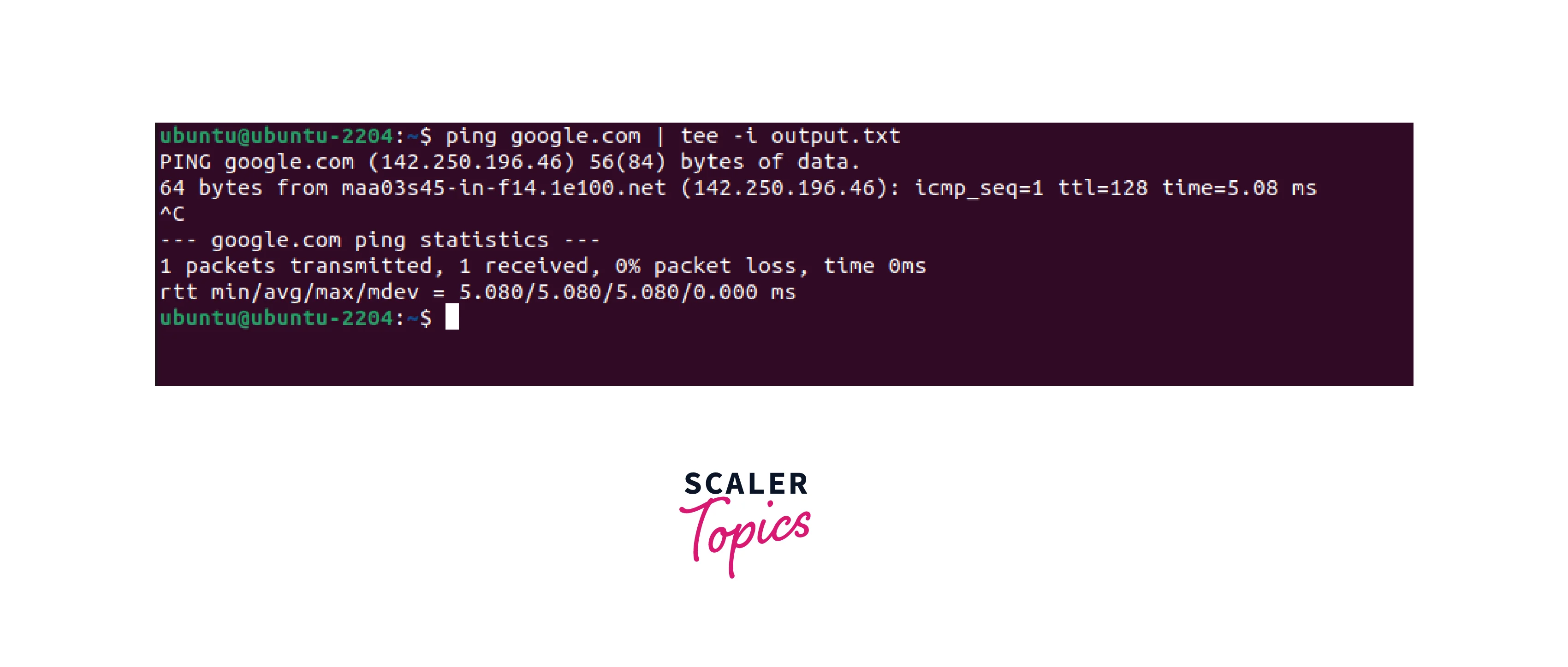 In the above example, the tee command is writing output in the output.txt file from the ping command and completes it successfully even after ping is interrupted with CTRL+C.