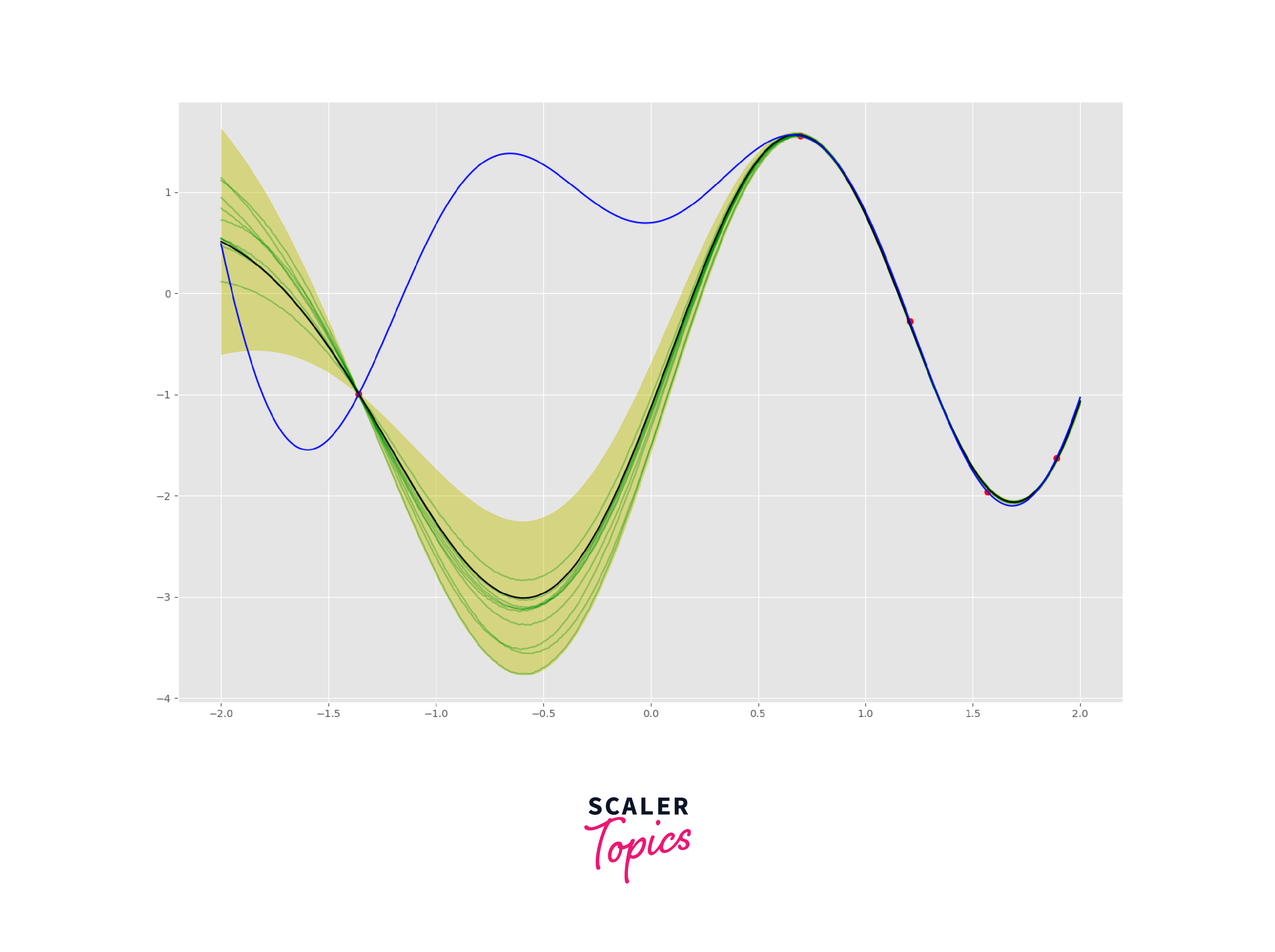 5. Visualizing Uncertainty: Visualizing uncertainty is often done by plotting the mean prediction along with the prediction interval (e.g., standard deviations) as shaded regions around the mean. This provides a clear understanding of the range of possible function values.