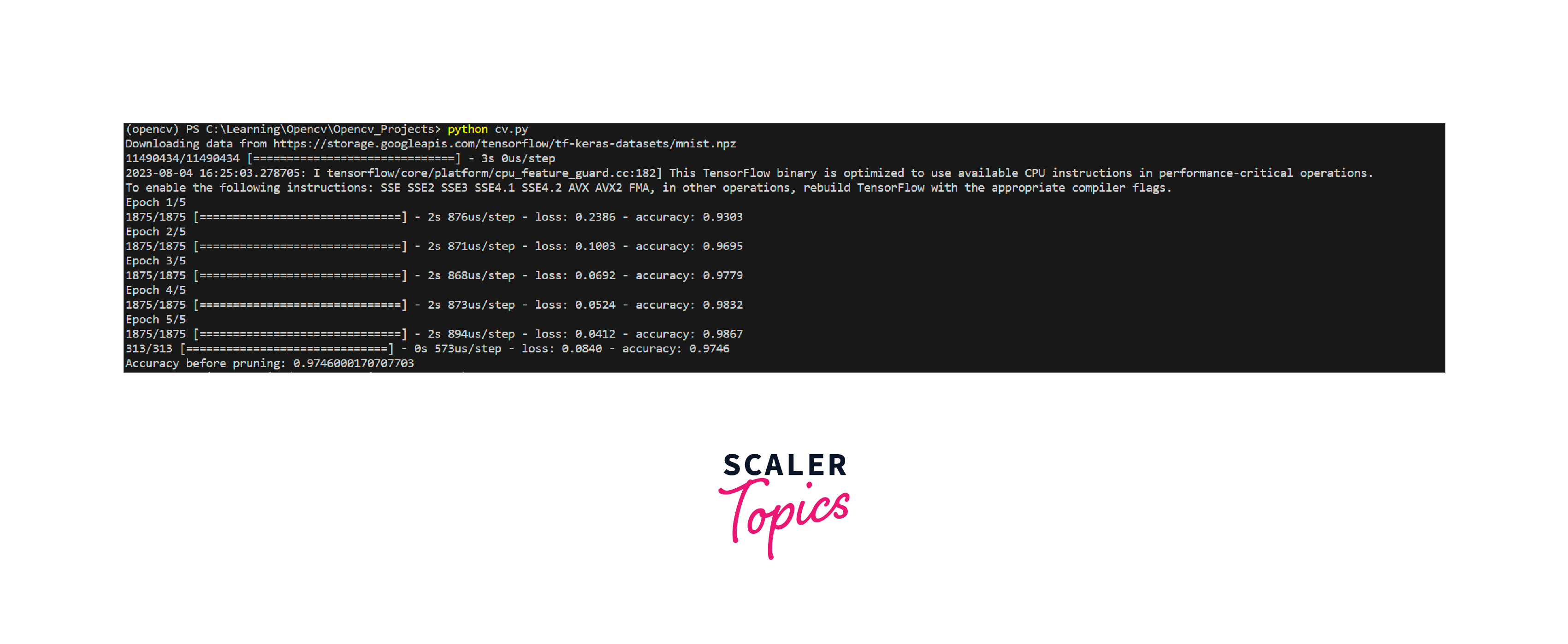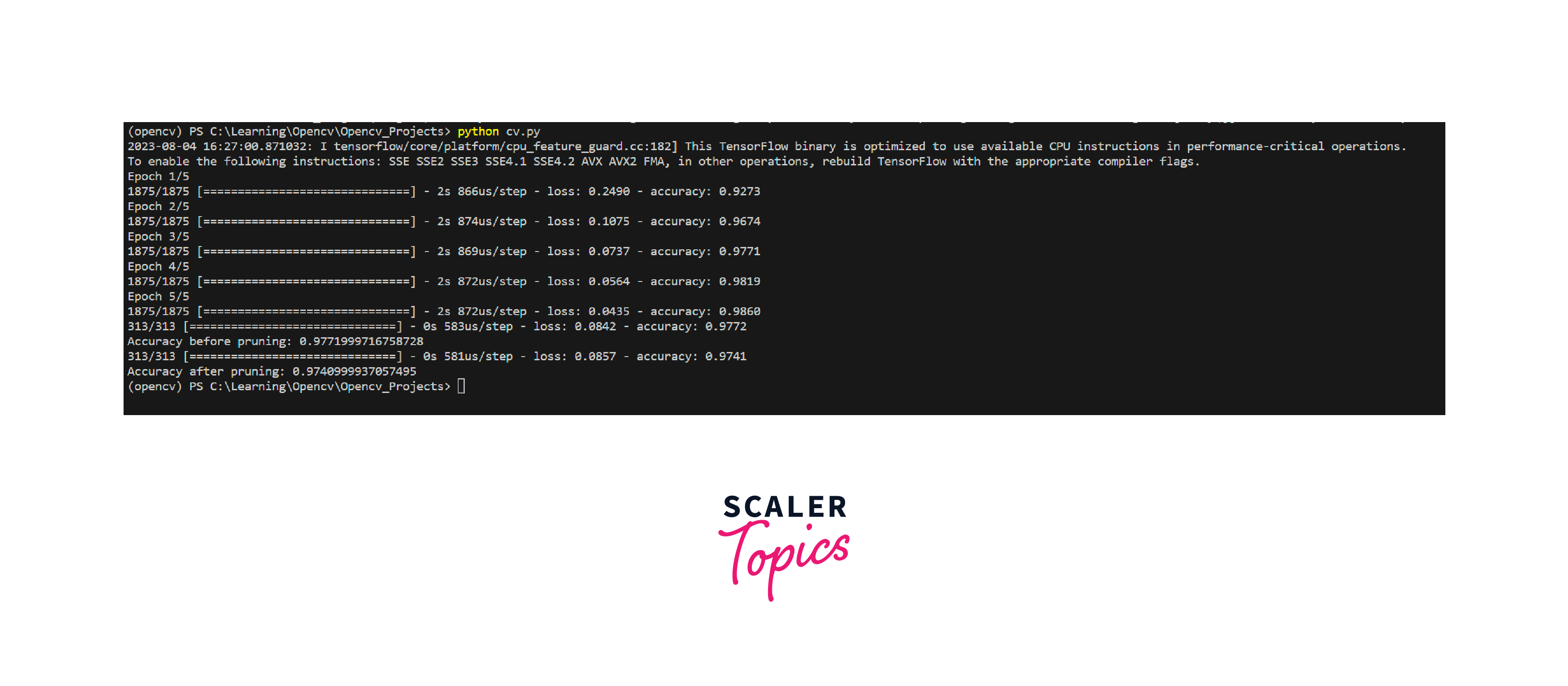 In above code, After pruning, we perform pruning- aware fine-tuning by training the pruned model on the dataset again using a smaller learning rate (0.0001) to allow the model to adapt to the pruning changes. This fine-tuning step helps the model recover from any performance degradation caused by pruning.