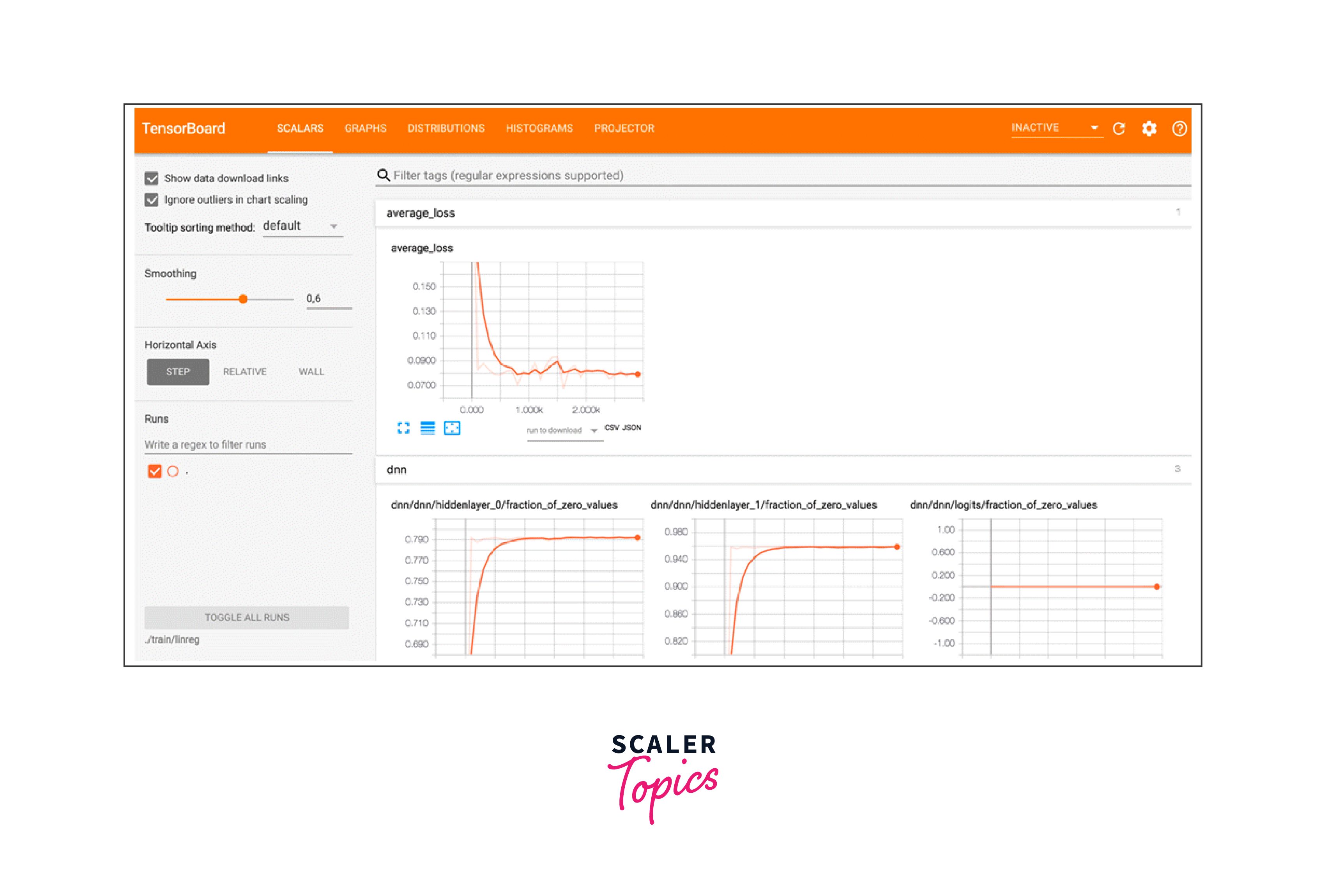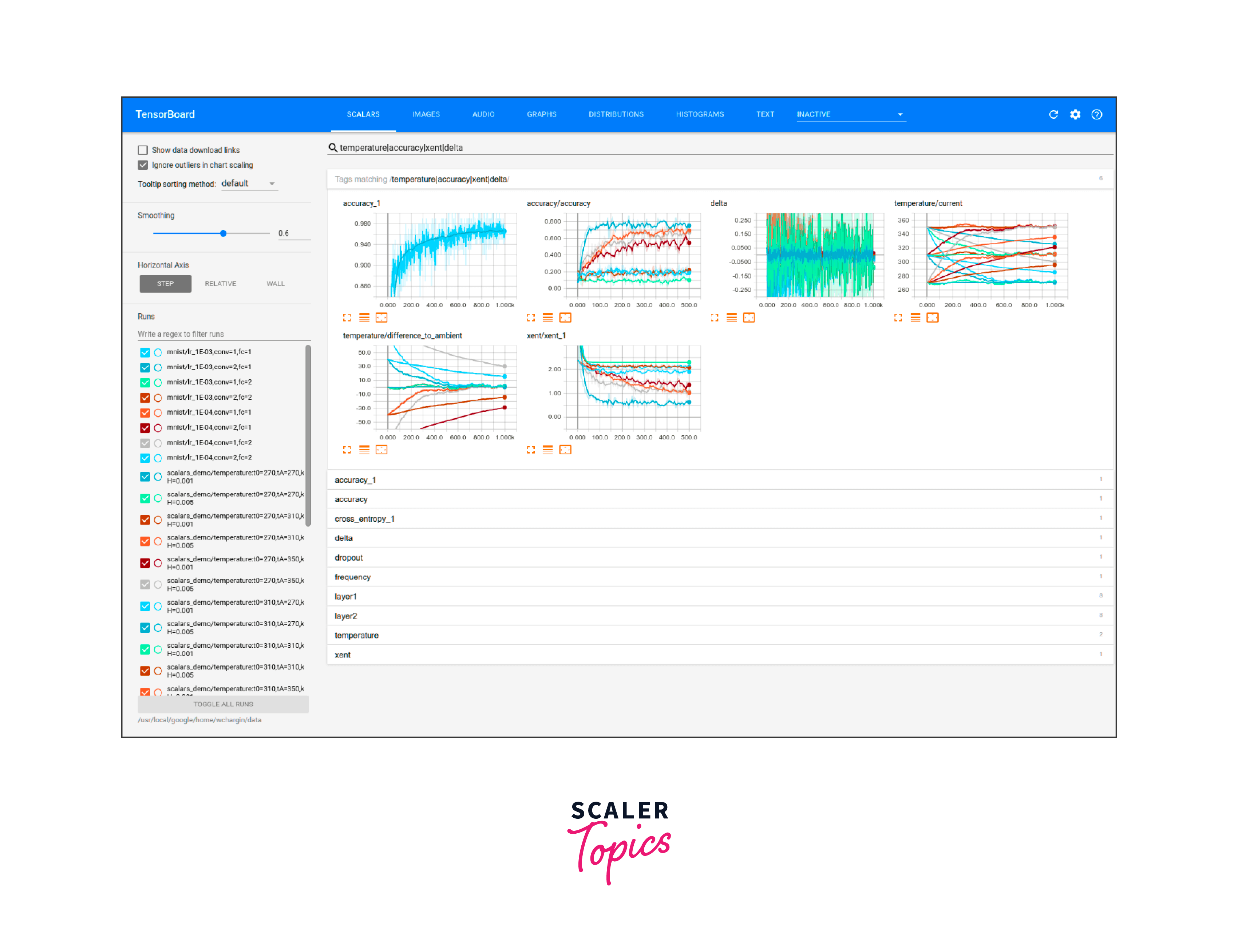 Scalars Dashboard: This dashboard displays scalar values over time. Scalars can include metrics like loss, accuracy, learning rate, etc. You can visualize how these values change during training, helping you identify trends, anomalies, and improvements.