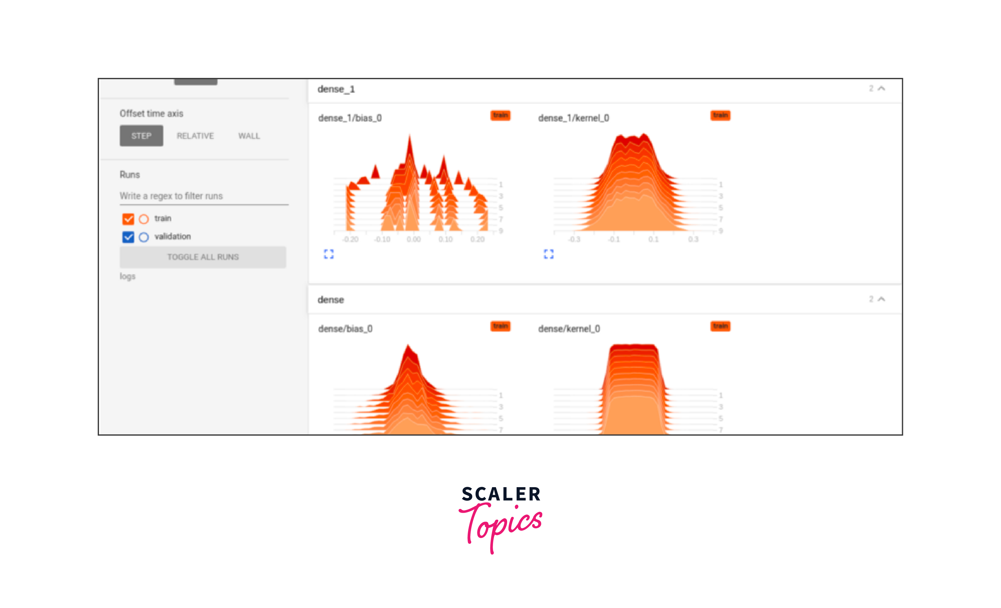 Histograms Dashboard: Similar to the Distributions dashboard, the Histograms dashboard displays histograms of tensor values. It helps you understand the distribution of values in your tensors and how they change over time.